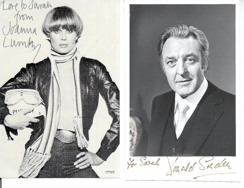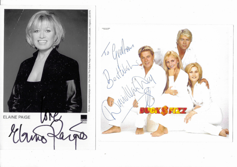 Autographed photos in album including Elaine Paige, Leslie Grantham, Leslie Phillips, Tony Britton, George Maharis, and various others. Also Adam Faith signed programme. (33)