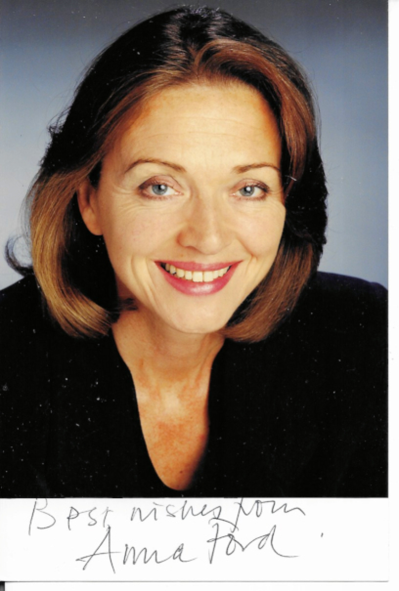 Autographed photos in folder, mostly 6 x 4”, including Anna Ford & other TV presenters, Robert Powell, Polly James, Viginia McKenna, Nigel Havers,