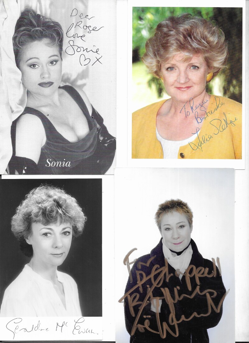 Autographed photos, PC size, in album including Geraldine McEwan, Sonia, Zoe Wannaker, Susan Hampshire, Frank Finlay, Steve Cram, Robin Cousins,