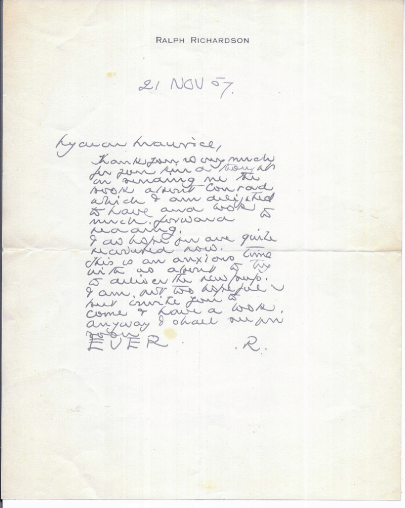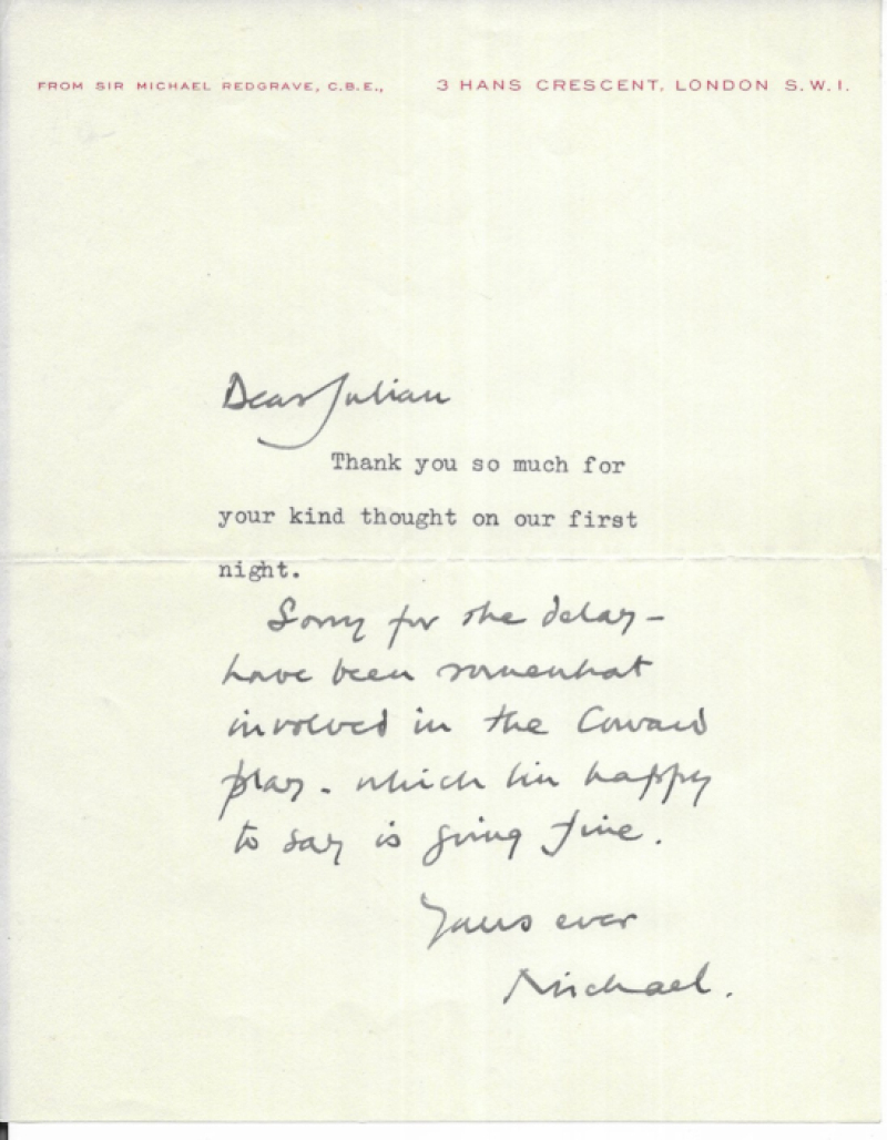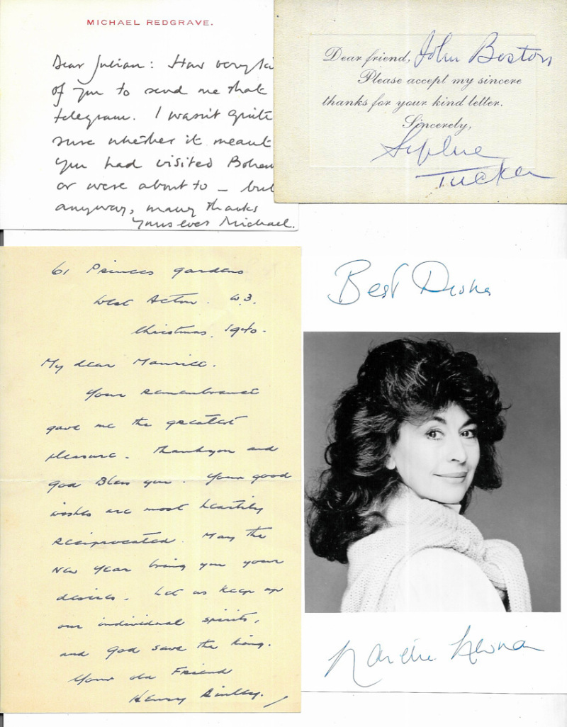 Autographs in folder, with many 19th & 20th Century letters, and signed photos, including ALS from Michael Redgrave (7, two TLS), Robert Atkins (2), Henry Ainley (4), Ralph Richardson (3, one TLS), ‘Jock' Alan Dent (5), George Grossmith, Donald Wolfit, and Tyrone Power Snr., (1828); plus ALS from 19th Century clerics and peers, and modern signed photos of entertainers. VG/VF (85 items)