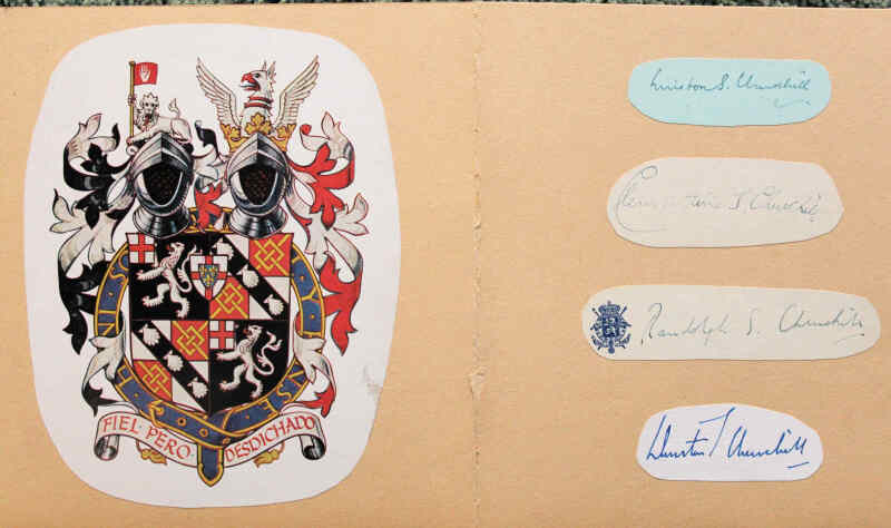 Autographs of Winston S. Churchill, Clementine S. Churchill, Randolph S. Churchill and Churchill's grandson Winston S. Churchill: cut signatures plus a coat of arms, all laid down in an improvised folder.