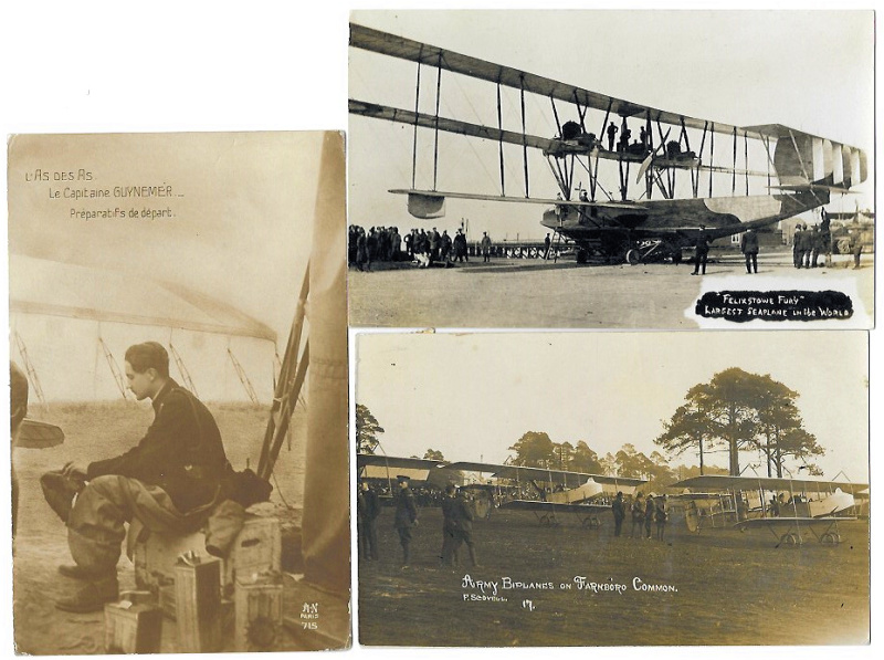 Aviation selection including RP close-up giant Felixstowe Seaplane; 1940/50s airliners (9), WWI French air ace Guynemer RP, Blackpool Air Show (PU 1909), and Army Biplanes at Farnborough RP by Scovell (PU 1916). Mostly VG to VF (16)