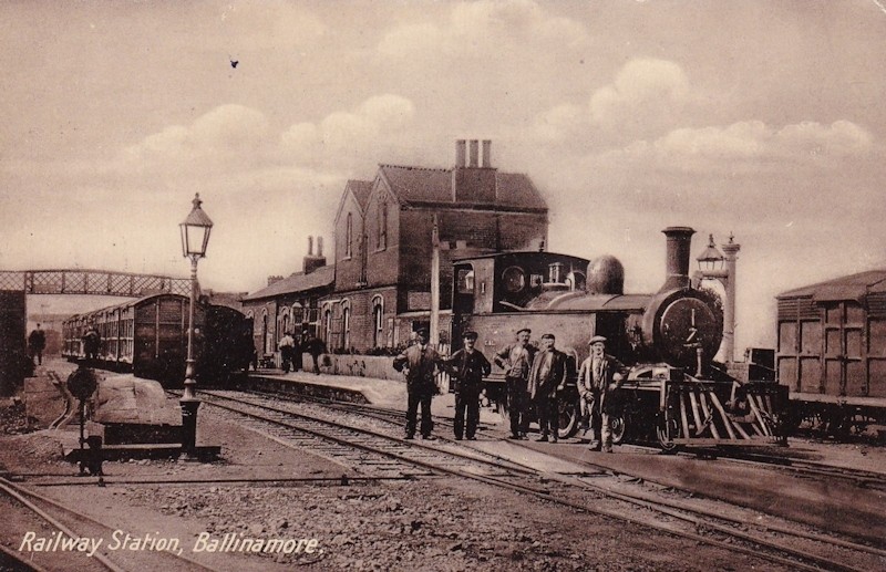 Ballinamore Railway Station, Ireland, attractive study with locomotive & staff. 1920s. Milton series. Posted 1954 from Dublin. Sepia