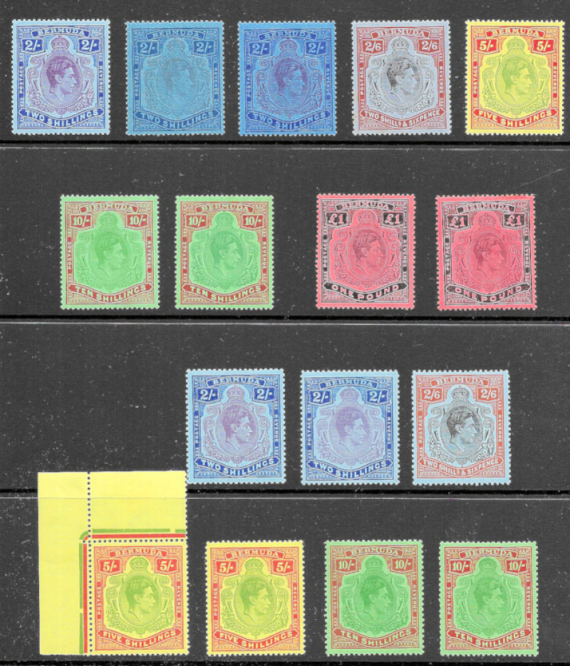Bermuda 1938-53 GVI High Values mint comprising Perf 14 2s (3), 2s6d, 5s, 10s (2) and One Pound (2); and Perf 13 2s (2), 2s6d, 5s (2, one UM) and 10s (2), various printings; small hinge marks, few Perf 14 issues with small tone marks on gum (£1 values unaffected). (16)
