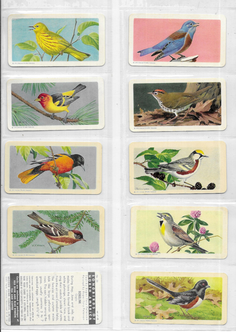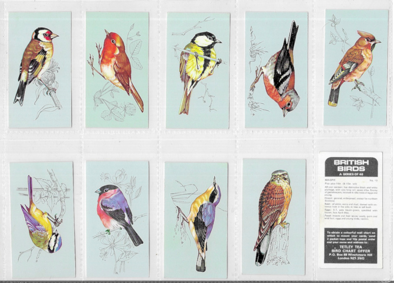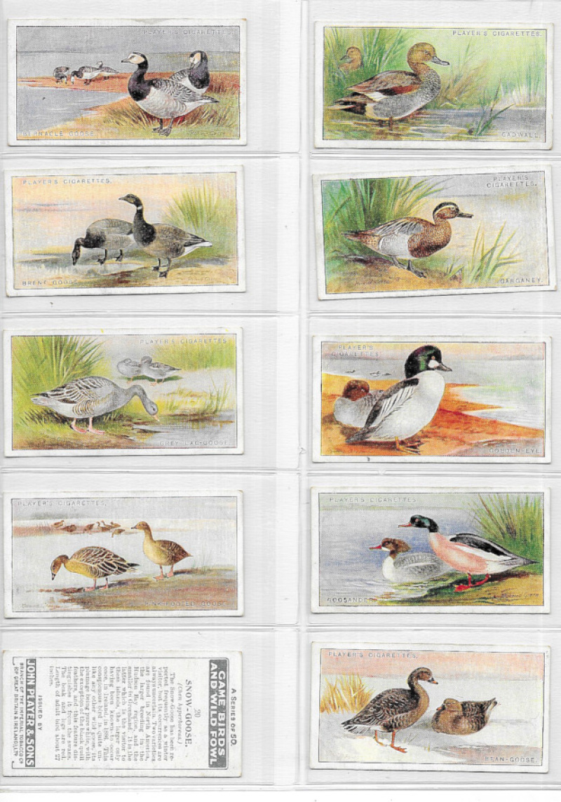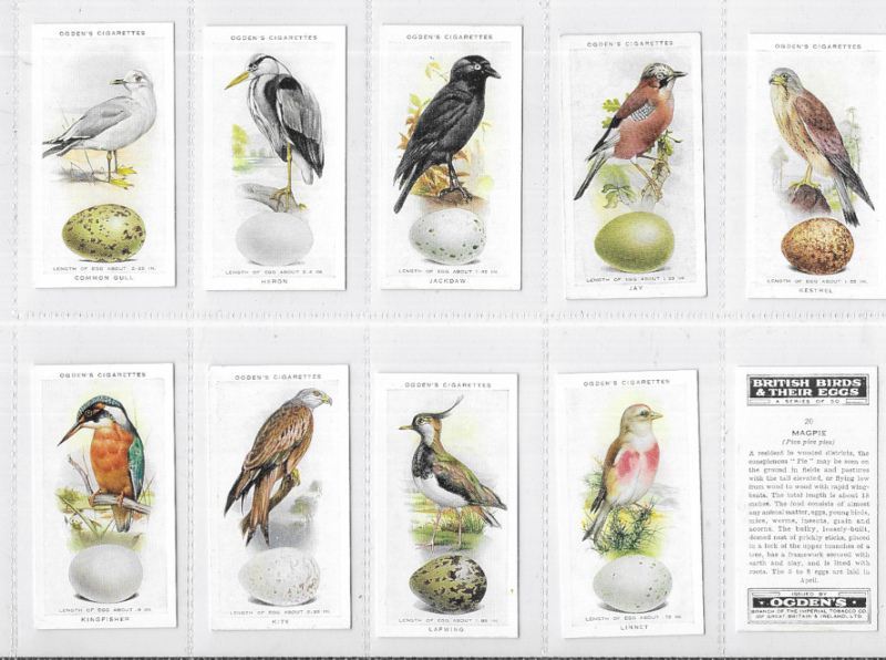 Birds sets in modern album including Ogden British Birds & Their Eggs 1939 and British Birds 1923; Player Game Birds & Wild Fowl; Phillips Bird Painting and British Birds & Their Eggs; Tetley Tea British Birds (two sets); Brooke Bond (Canada) Songbirds of North America; Wills British Birds 1915; and others. Good to VF+. Cat (Murray) £850. (13 sets)