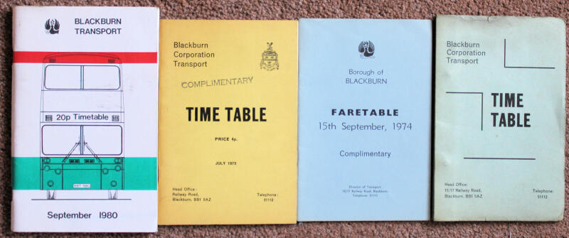 Blackburn Corporation Transport Timetables (5) and Faretables (7) 1970-80, one with a folding map, mixed condition.