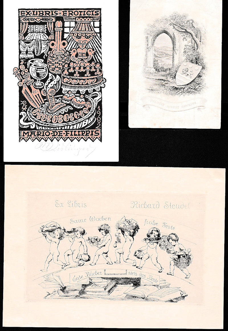 Bookplates from 18th Century to 1930s, including Thomas Bewick types (2), mostly 19th Century armorial designs plus some interesting 20th Century including proof engravings and erotic. Also few items of unrelated ephemera. Fair to VF (74 items)