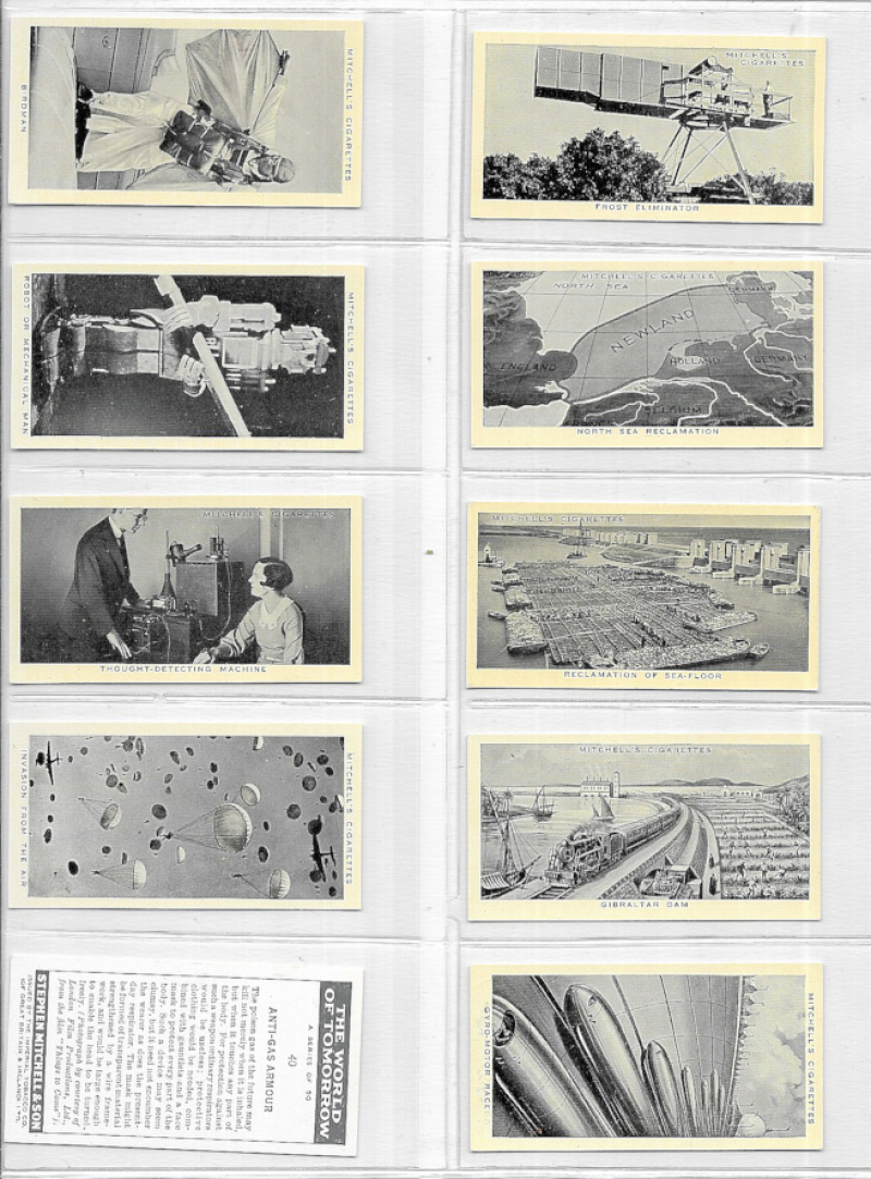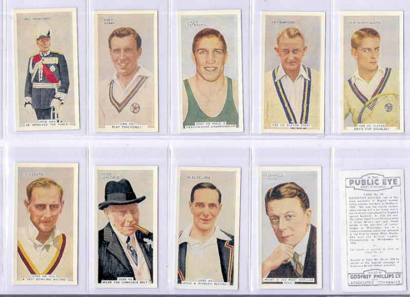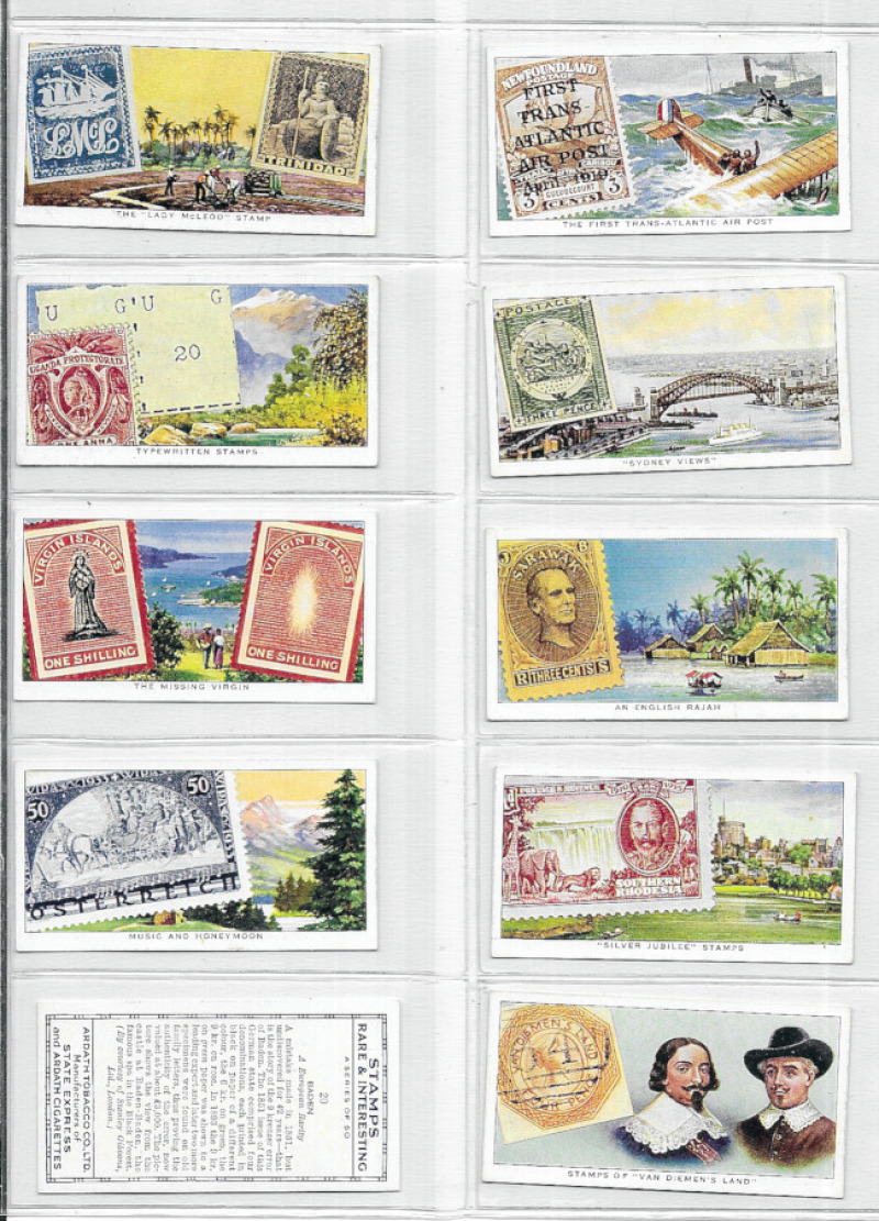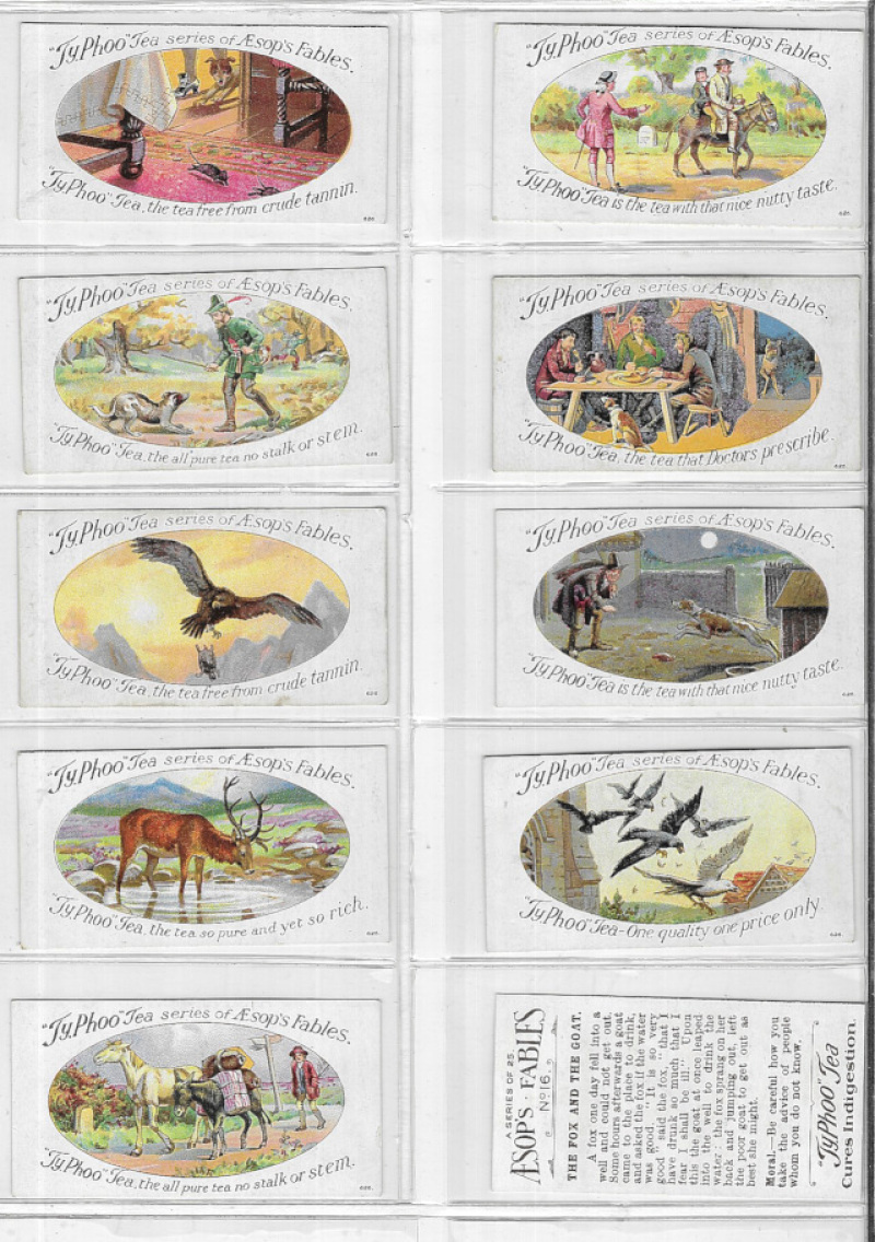 Box of Cigarette and Trade Card sets in plastic sleeves from wide range issuers including Godfrey Phillips, Stephen Mitchell, Ardath and modern trade cards. Includes Woods Aesop's Fables and Romance of the Royal Mail; Mitchell Famous Scots, The World of Tomorrow and Clan Tartans 2nd series; Phillips Characters Come to Life and In the Public Eye; Ardath Stamps Rare and Interesting; Typhoo Aesop's Fables; Kane Red Indians; and a variety of others. Largely VG/VF, many excellent. (24 sets)