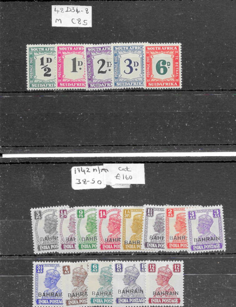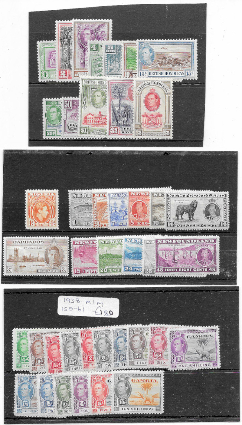 British C/Wealth George VI mint selection with Gambia 1938 to 10s, British Honduras 1938 to $5, Bahrain 1942 to 12as, South Africa 1948 Postage Dues, Newfoundland 1937 Coronation long set (UM), Barbados 1946 Victory 3d with ‘Kite Flaw' UM (small crease), and scarce Nigeria 4d orange. VG/VF and Cat £840.