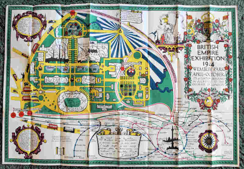 British Empire Exhibition 1924 Wembley Park April-October. Its situation described in relation to the railways of London. Dobson & Molle, 1923, fold-out pictorial map with descriptive text and illustrations to verso. Some small faults.