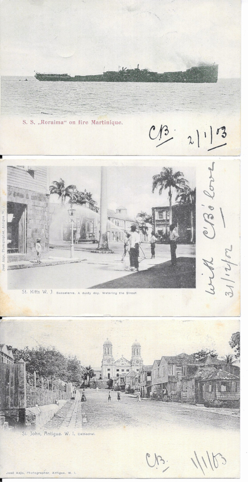 British West Indies 1902-03 PPCs from Antigua (4), St. Kitts-Nevis (4), Dominica (2), St. Lucia (5), Trinidad (2) and Jamaica (3), to Belgium and UK, ten with Leeward Is 1d adhesives, fair to fine. Five show scenes in Martinique. (20)