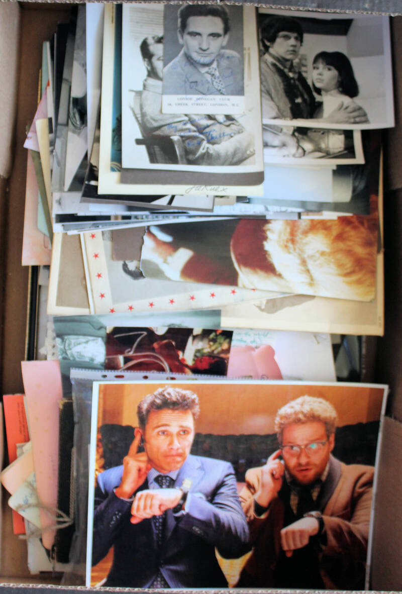 Carton of Cinema & Theatre ephemera including many photos, programmes, postcards etc. Many items with printed signatures but some ink-signed noted. 1940s to 1980s. (100s)