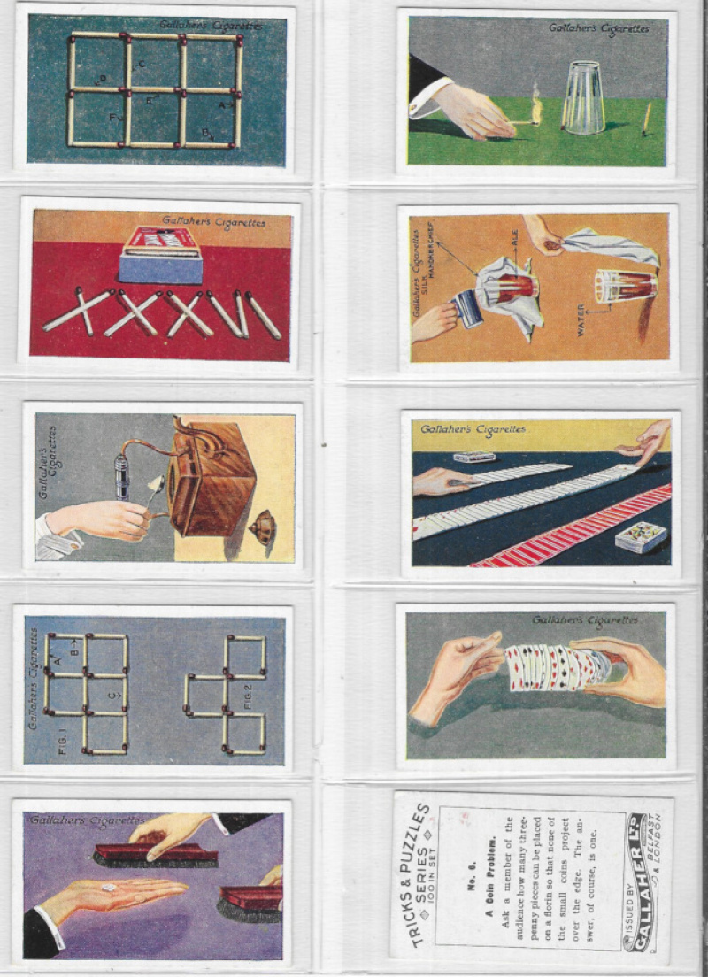 Carton with 30 sets in two modern albums and plastic sleeves including Gallaher Tricks & Puzzles Series 1933, Army Badges and Woodland Trees Series 1912; Lambert & Butler Pirates & Highwaymen and Famous British Airmen & Airwomen; Lloyd Old Inns; Mars Wonders of the Queen Mary; King's Laundries Famous Railway Engines; Wix Builders of Empire; Murray Steam Ships; Ardath Stamps Rare & Interesting; B.A.T. War Incidents; Goodies Indian Tribes; Tetley Tea British Birds (two sets); and other useful including Wix Kensitas Flowers (41, mostly size L), and a pack of plastic sleeves (as new). Generally VG/VF (Large qty).