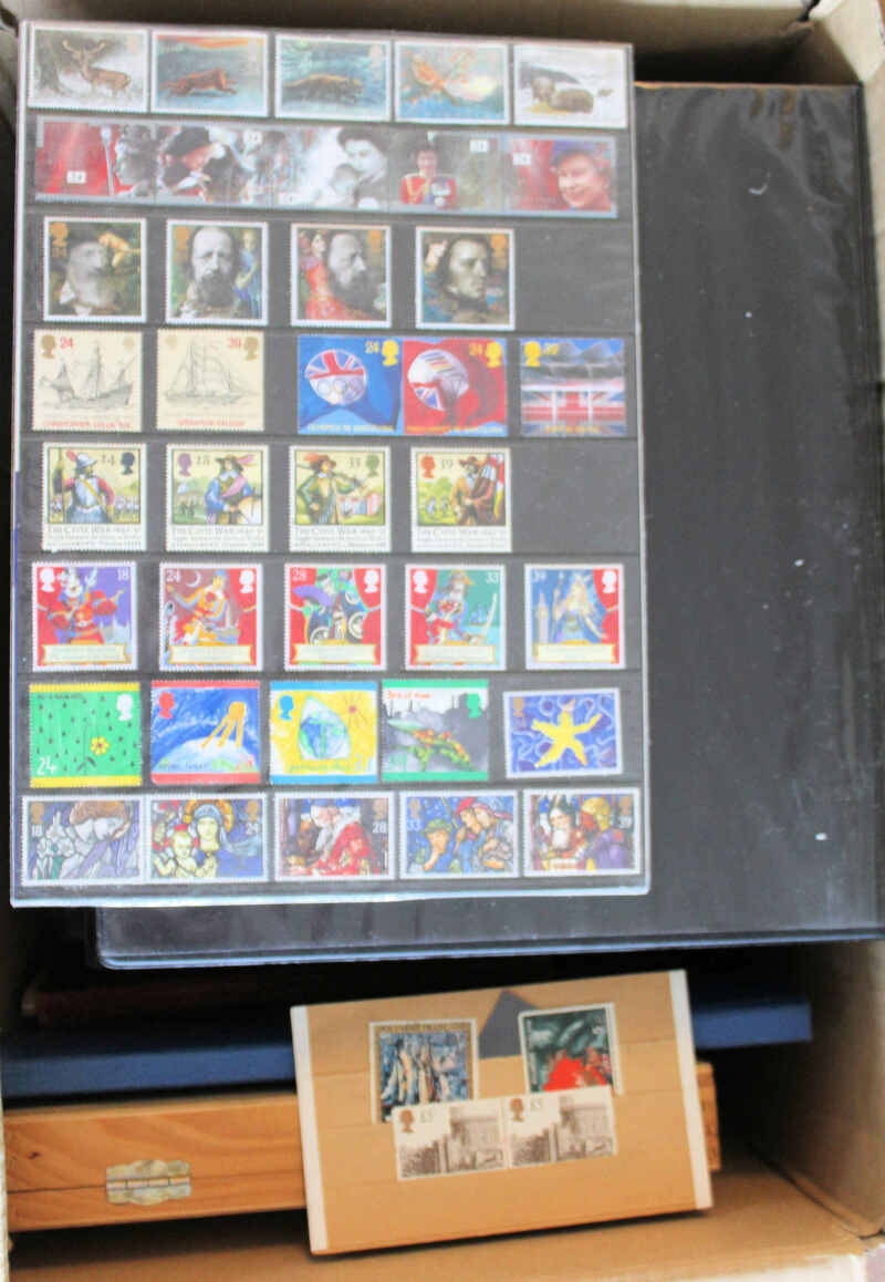 Carton with accumulation in binders, stockbooks & loose, plus old junior album and accessories; mostly modern including two albums of GB FDCs and some mint GB Decimal including 1992 Year Pack and pair £5 Castles. (Large qty.)