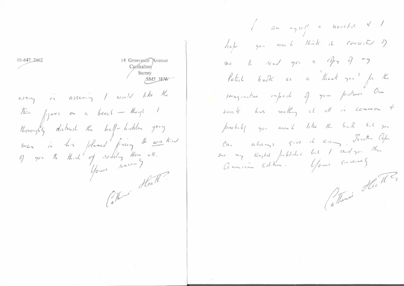 Catherine Heath Lady on the Burning Deck, Taplinger, New York, 1979, first U.S. Edn., in d/jkt, signed on the half-title, together with two autograph letters from the author to the artist Claude William Harrison, one of which had been enclosed with the signed book. Some wear to the d/jkt (not price-clipped).