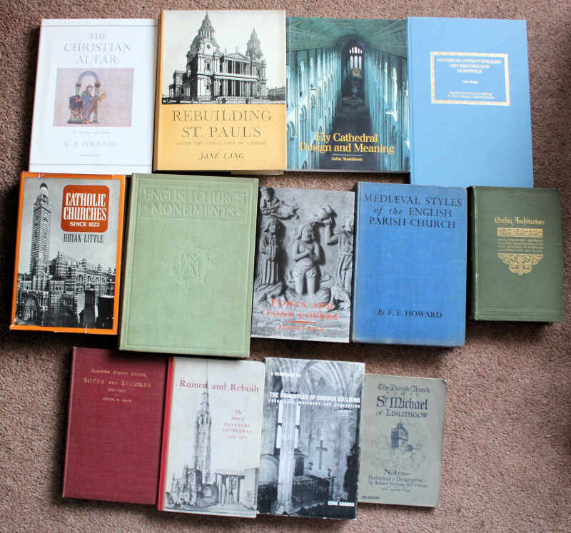 Church Architecture and History including Howard Mediaeval Styles of the English Parish Church 1936, inscribed by the author; Sykes Ramsden Street Independent Chapel Huddersfield 1925; Crossley English Church Monuments 1150-1550 Batsford [1921]; Corroyer Gothic Architecture 1893; and Lang Rebuilding St.Paul's Oxford 1956. Good to fine. (13)