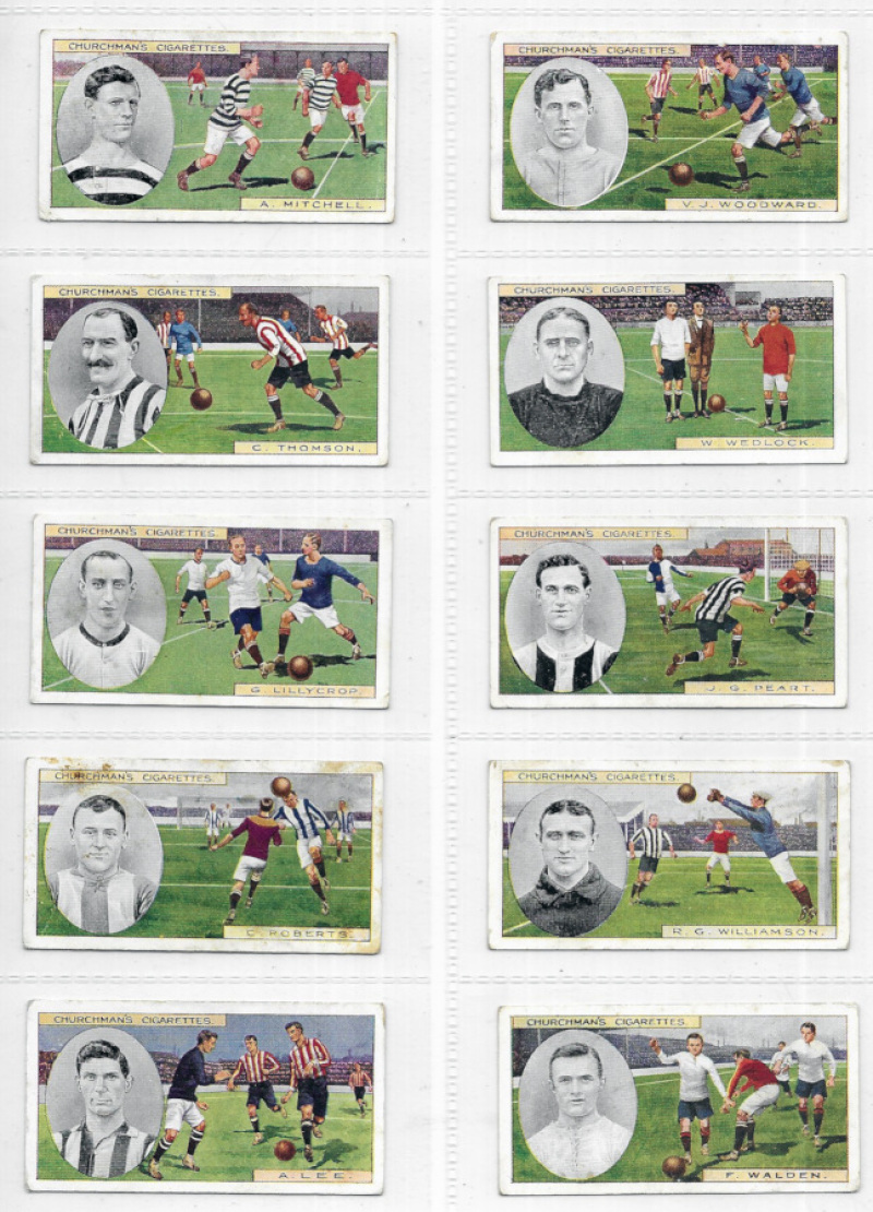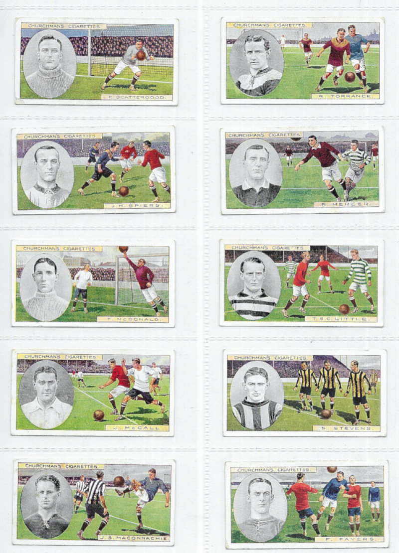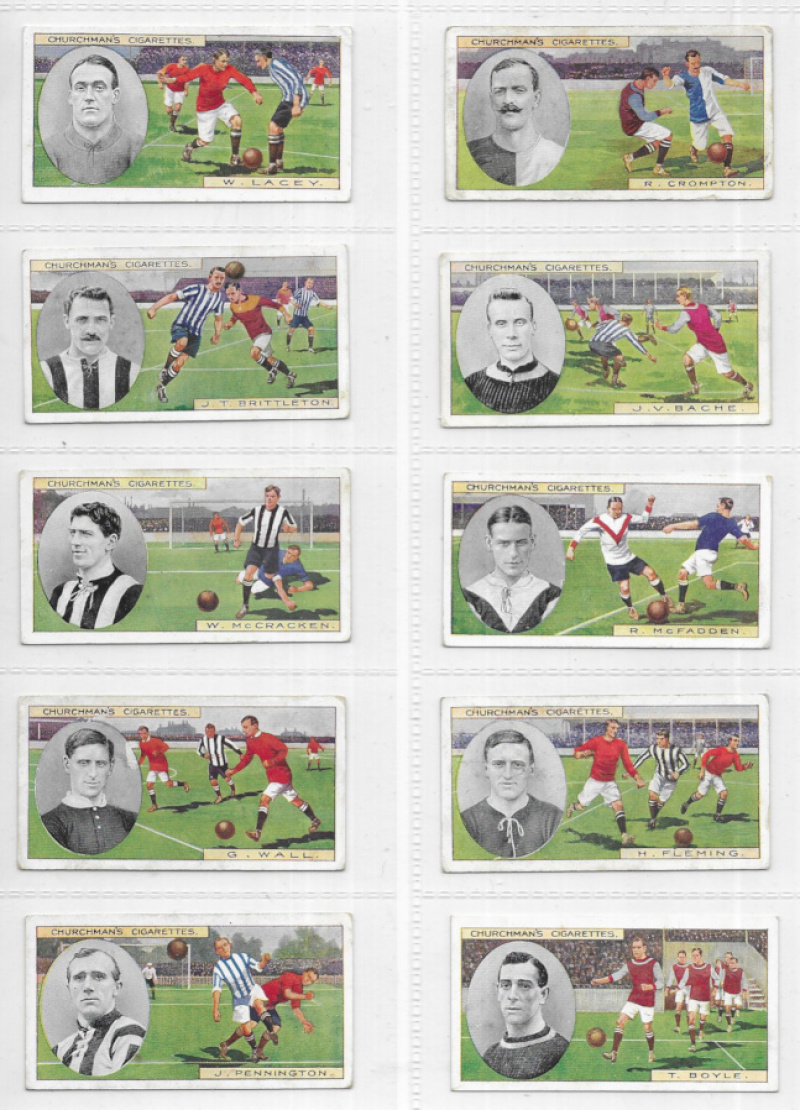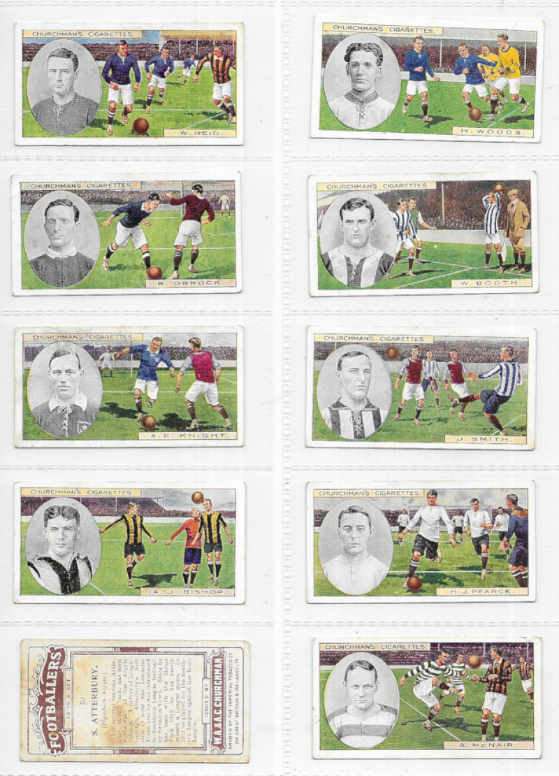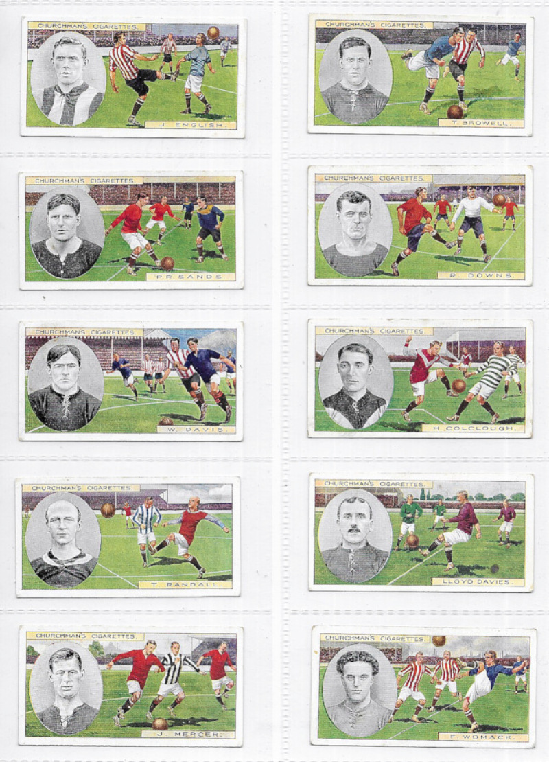 Churchman Footballers 1914, coloured, set of 50, fair to fine, #1, 9, 19, 24, 37, 45, 46, 47, 48 with small faults; #7, 8, 19, 22, 23, 37, 38 & 50 with tone marks on backs; others VG or better. A scarce set.