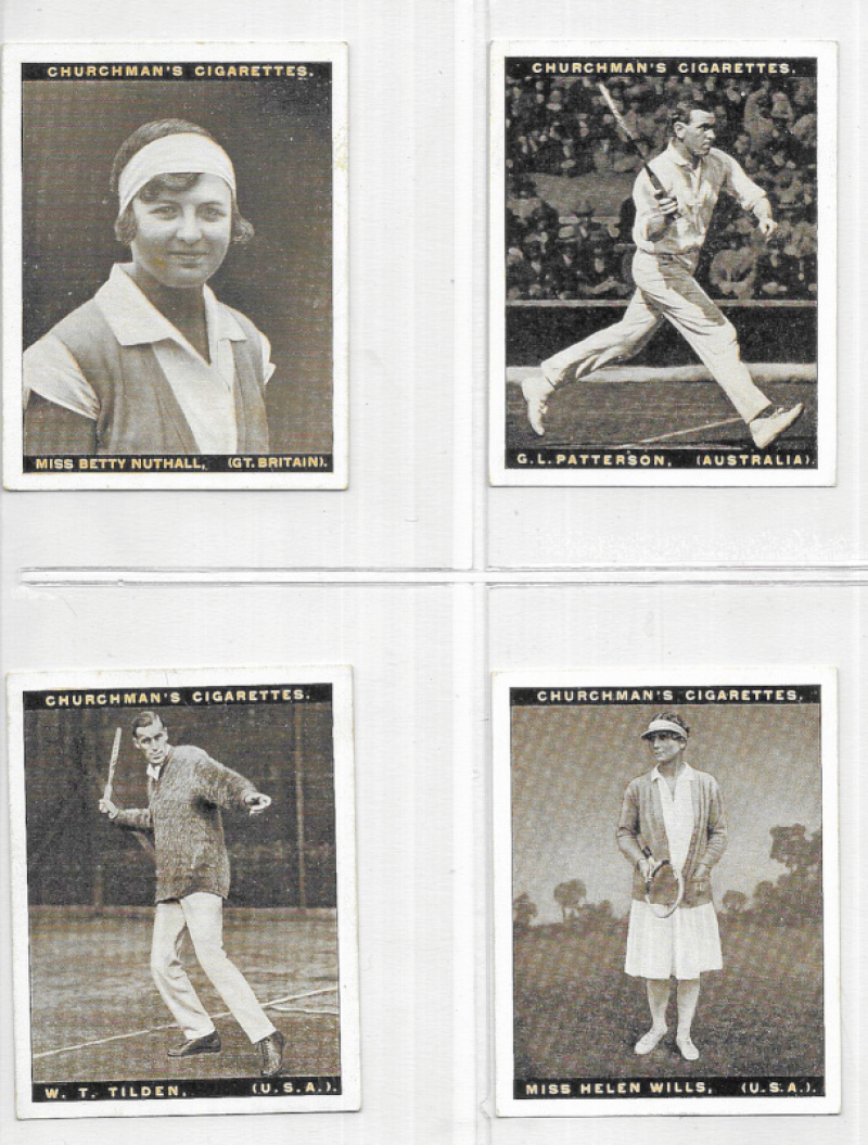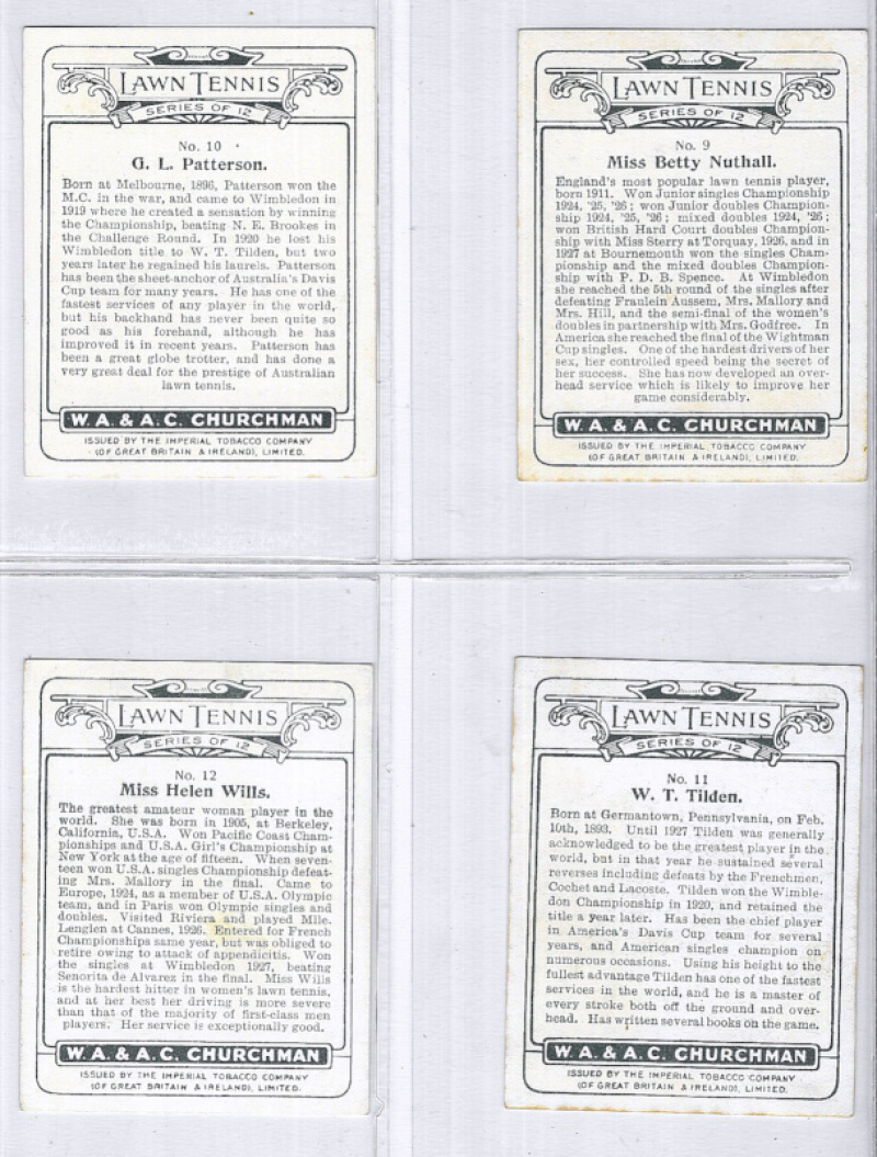 Churchman Lawn Tennis 1928, size L, the set of 12, VG to excellent, #8 (Mdlle. Lenglen) with slight wear to one corner, tiny tone mark on back of #12 (Helen Wills). (12)