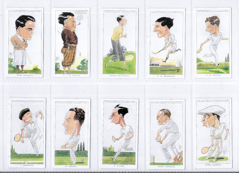 Churchman Men of the Moment in Sport 1928, the set of 50, mostly good to fine; card #1 stained; #3, 11, 18, 27 (Bobby Jones), 34, 36 and 47 slightly marked. Small fox mark to back of #15. (50)