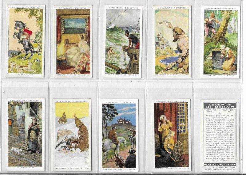 Churchman standard size sets comprising Men of the Moment in Sport (#1 stained, others good to VF), Famous Railway Trains, Frisky (fair to fine), and Legends of Britain. Cat (Murray) £645.