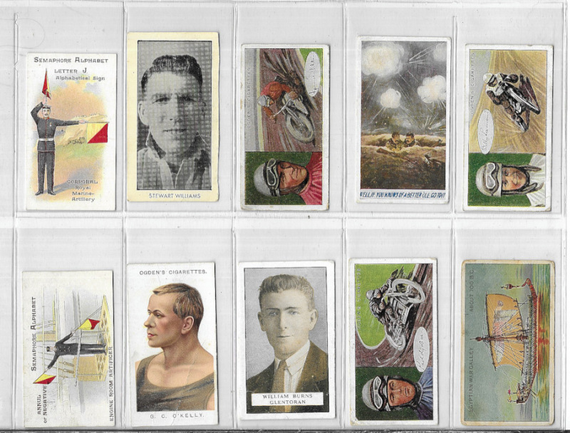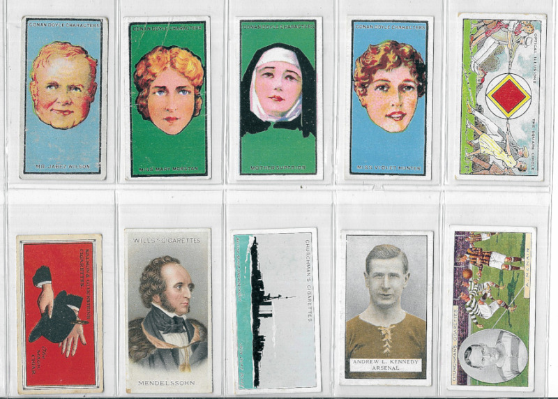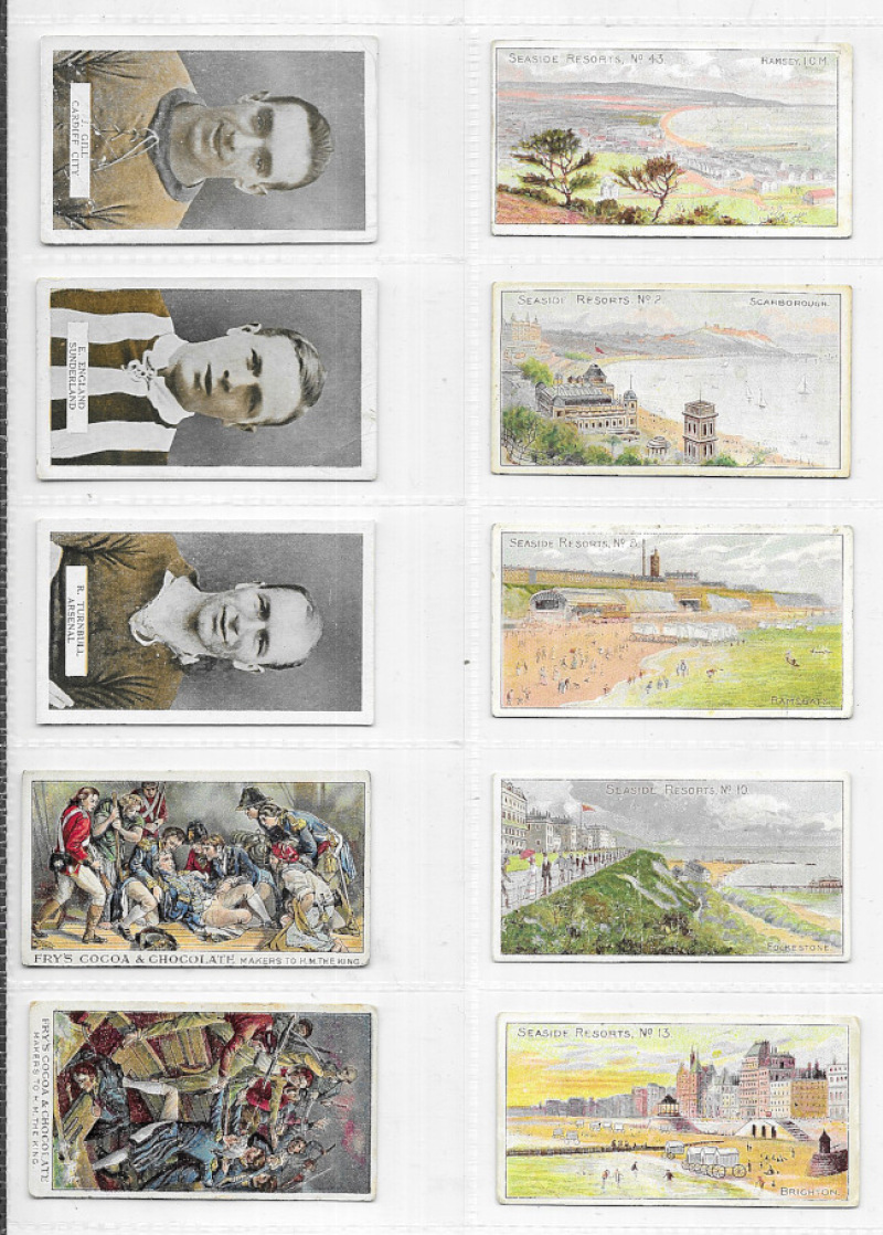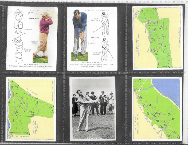 Cigarette & Trade card odds / type cards in plastic sleeves with many better items including Wills' Seaside Resorts (5), Barratt South African Cricketers (2) and Australian Cricketers (4), Hill Fragments from France (1, coloured), Churchman Footballers (1, coloured), Player Championship Golf Courses (5), and various others including golf & football interest. Some mixed condition but generally good to fine. (172)