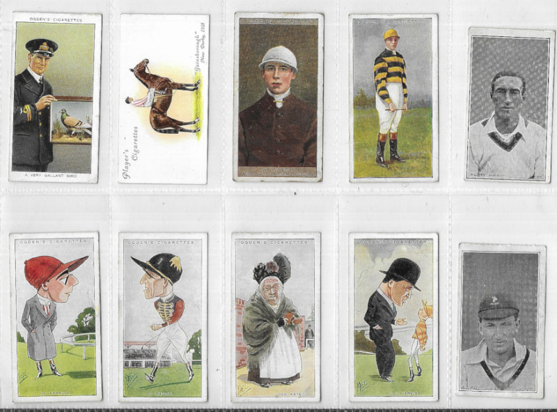 Cigarette & Trade card odds / type cards in plastic sleeves with many better items including Wills' Seaside Resorts (5), Barratt South African Cricketers (2) and Australian Cricketers (4), Hill Fragments from France (1, coloured), Churchman Footballers (1, coloured), Player Championship Golf Courses (5), and various others including golf & football interest. Some mixed condition but generally good to fine. (172)