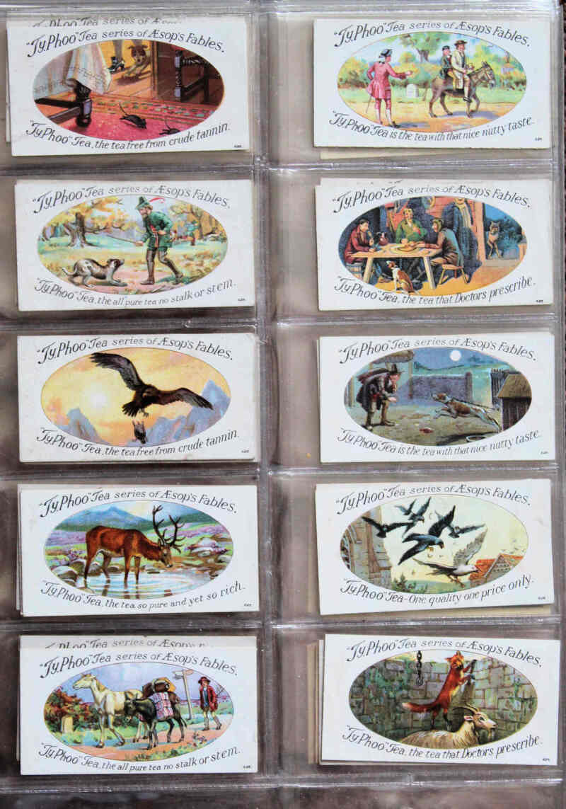 Cigarette & Trade Card sets in three modern albums in largely VG/VF condition, various issuers including Wills, Gallaher, Typhoo, Phillips, CWS, B.A.T. (Britain's Defenders 1914), Mitchell, W.H. & J. Woods (Romance of the Royal Mail and Aesop's Fables), Sarony, Carreras, and others. Wide range of subjects. (43 sets)