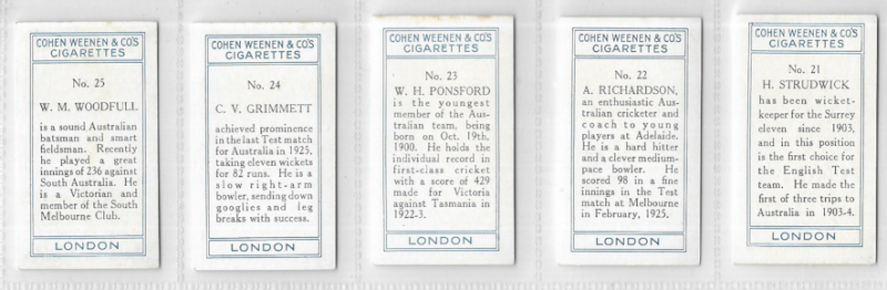 Cohen Weenan Cricketers 1926, the set of 25, fair to excellent, #5 & 7 with light crease, five cards show slight toning on backs along top edge. A scarce set. Cat (Murray) £675