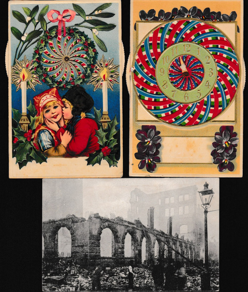 Collection in 2 old albums with much South of England topography, novelty Kaleidoscopes (2), Bristol Fire disaster (2),some WWI themes, few glamour. Varied condition. (242)