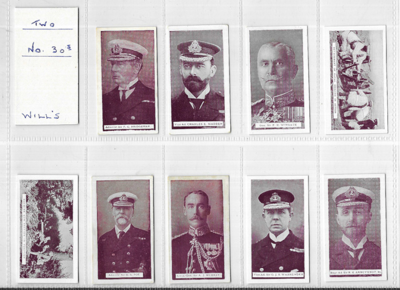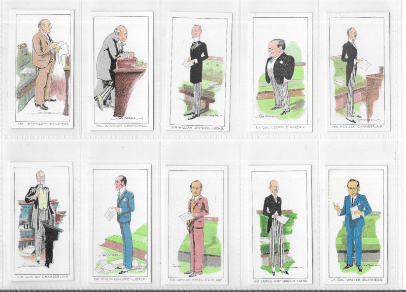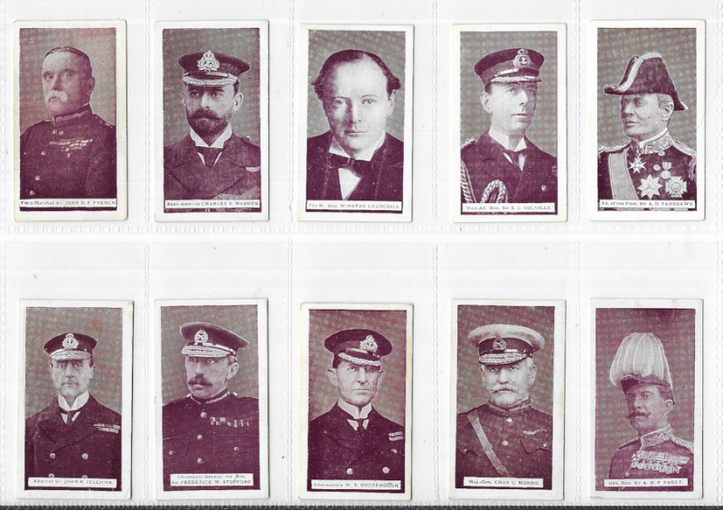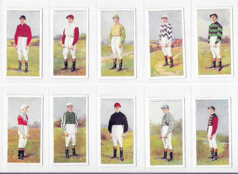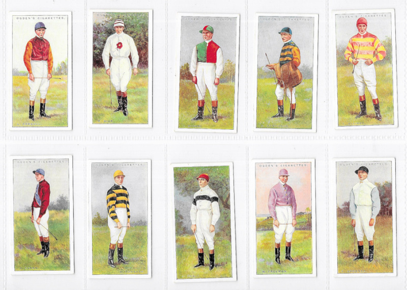 Collection of 15 fine WWI to modern sets in album including Wills (Scissors) Britain's Defenders 1915 (red back) with two different #30 (Bridgeman and Madden); Ogden Jockeys 1930; Bocnal Proverbs Up-To-Date 1938; and Carreras Notable M.P.s (standard size). The modern sets include Dormy Golf – The Modern Era. (488)