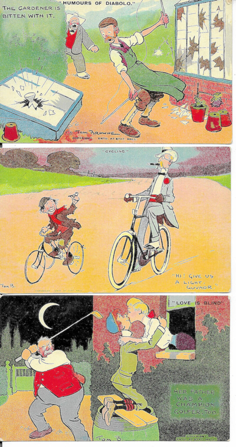 Collection of mainly PU cards addressed to Sheffield, 1900s to WWI, with interest in comic including Tom Browne (16) and other named artists, many of children, plus pretty ladies, greetings, Bamforth Song cards etc. Also some family photos including late-19th cabinet types. Includes nice advert for Pan Yan pickle featuring Bonzo dogs. Mixed condition. (c.450)