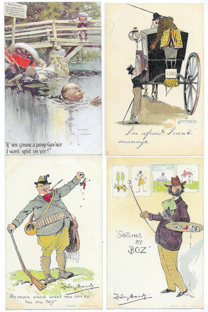 Comic selection, pre-1930, many EVII period, including W. Heath Robinson ‘The Gentle Art of Catching Things' (6, two with abrasions), Thackeray ‘Write Away' (2), Lawson Wood (6), Dudley Hardy (7), Hassall (3), sports humour (15, mainly Kinsella and Tom Browne), ‘At the Seaside in Dollyland' (6), and others. Mixed condition, many good/fine. (67)