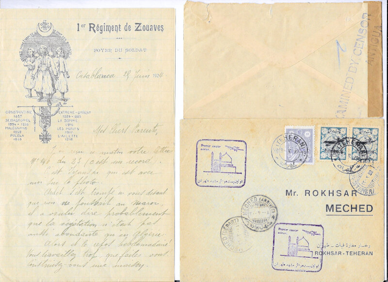 Covers & PCs, 1898-1951, many military & censored; with 1898 & 1905 French Forces in Indo-China; 1929 Persia first flight; WW2 Censors of Antigua, British Guiana, Martinique (3), & Tahiti; 1951 Greece currency control; and various others. Includes attractive letter sheet from French soldier in Casablanca. (25)