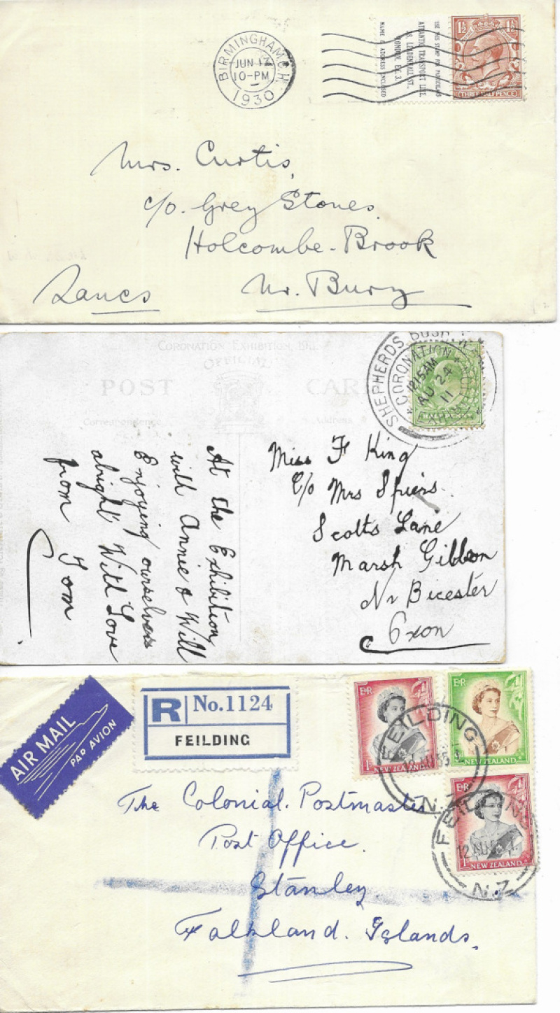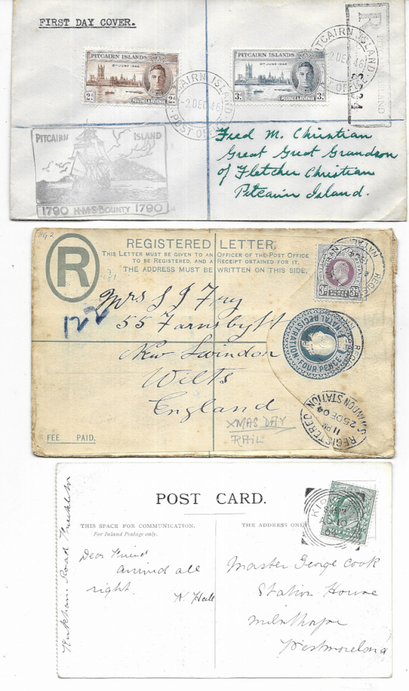 Covers & PCs including 1904 Natal registered to UK with REGISTERED / SWINDON STATION Christmas day oval; 1904 scarce KIRKHAM sq.circle; 1946 Pitcairn Is registered to Fred Christian; 1955 New Zealand to Falkland Is registered airmail; and various others. (22)