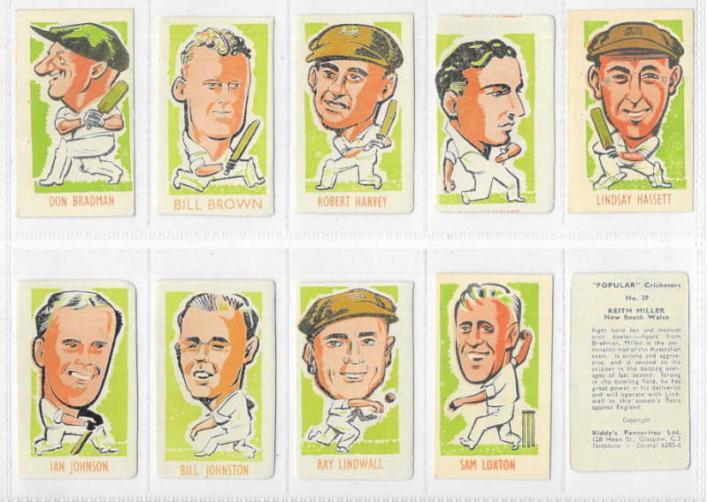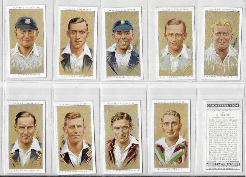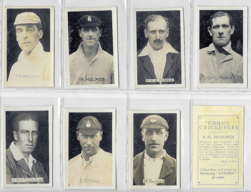 Cricket interest, an album of seven sets including D.C. Thomson County Cricketers (in uncut pairs); Morris Australian Cricketers; Kiddy's Favourites Popular Cricketers (28 with rounded corners, #23 & 48 miscut); Chums Cricketers 1923; and Player Cricketers,1934. Mostly VG or better, many excellent. Cat (Murray) £700. Also 4 postcards.