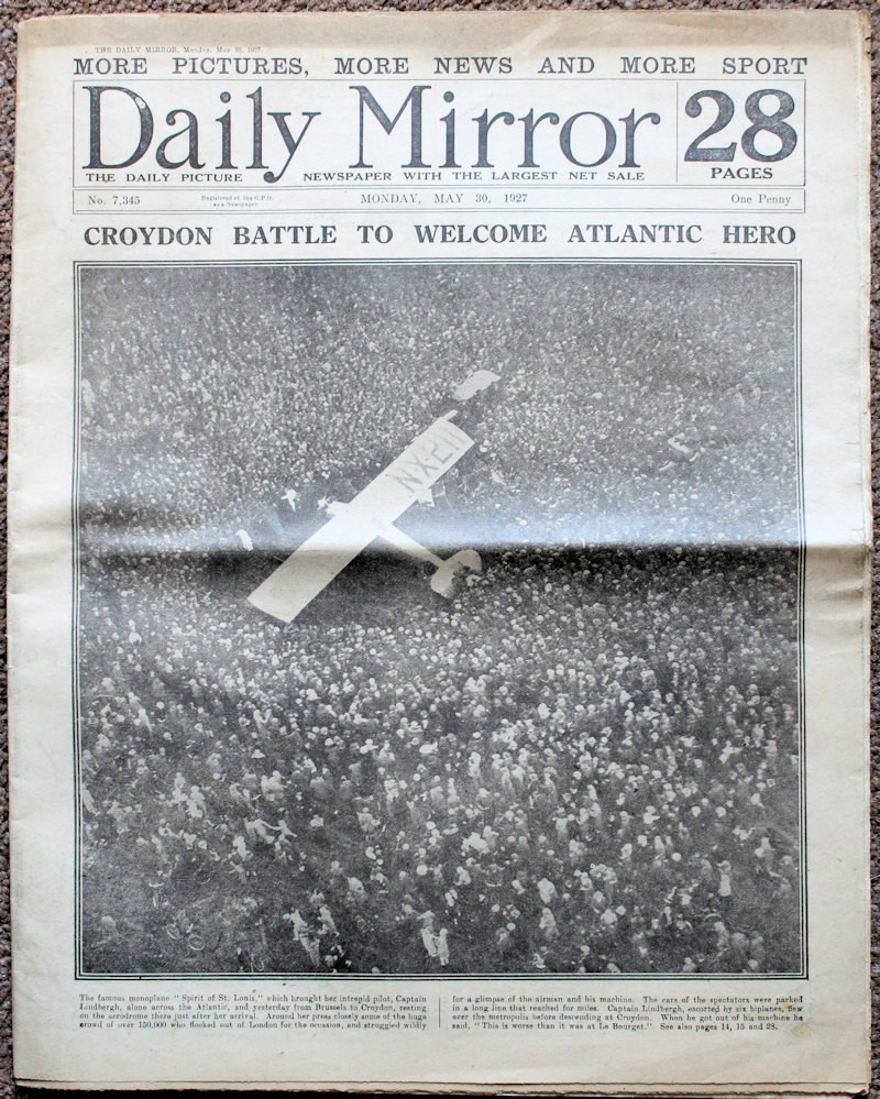 Daily Mirror for May 30th 1927 celebrating Lindbergh’s arrival at Croydon, complete newspaper with additional photos on back cover. Dust-affected along top edge of front page otherwise very good. Central fold.