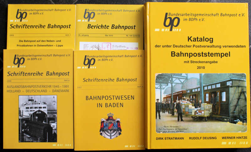 Dirk Stratmann & others Katalog der unter Deutscher Postverwaltung verwendeten Bahnpoststempel, 2010, large format h/bk, pictorial boards, 496pp; a comprehensive listing of the Railway TPOs of Germany with illustrations of the various types, together with three companion volumes in softback covering aspects of the history of the German TPO system, and a related journal, 2008-2010. Fine (5)