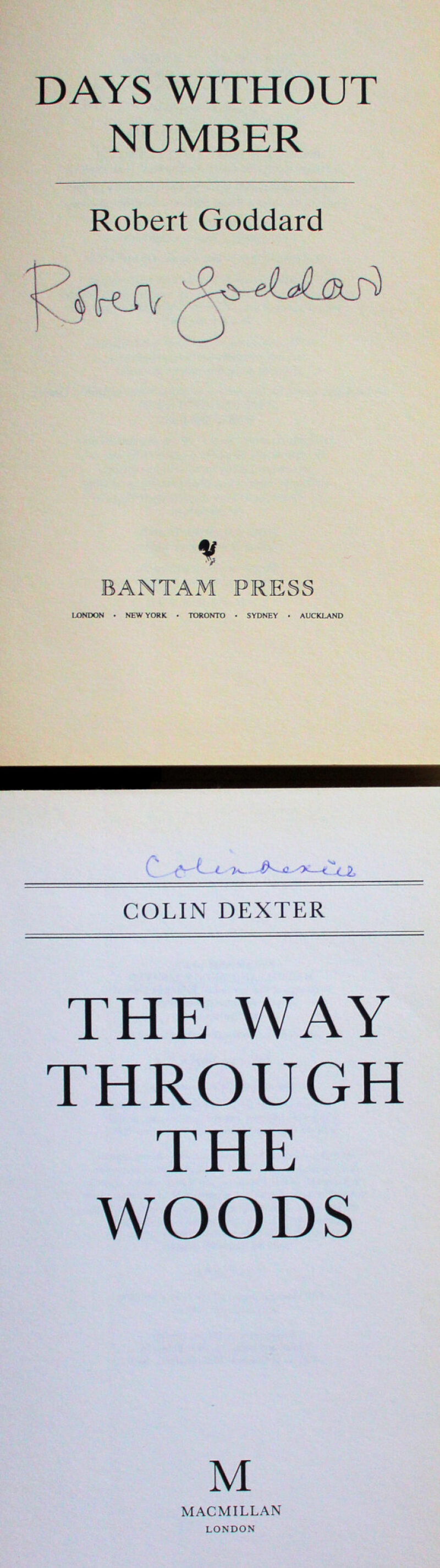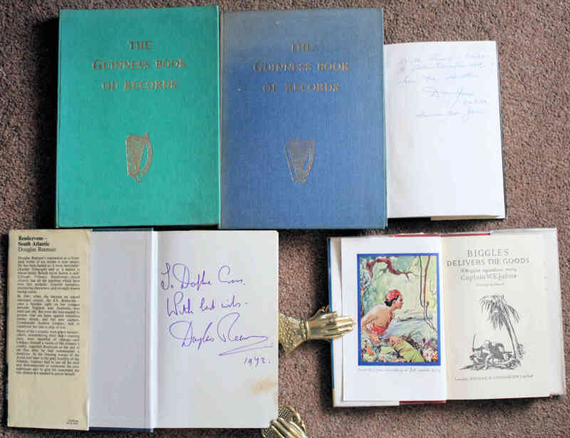 Donald Jones Escape from Sulmona 1980, first edn., signed & inscribed by the author, in d/jkt; and other signed first editions by Douglas Reeman, Robert Goddard and Colin Dexter; a Biggles first edition in VG d/jkt; and Guinness Book of Records 1955 and 1956 editions, the 1955 edition with boards bowed. (6)