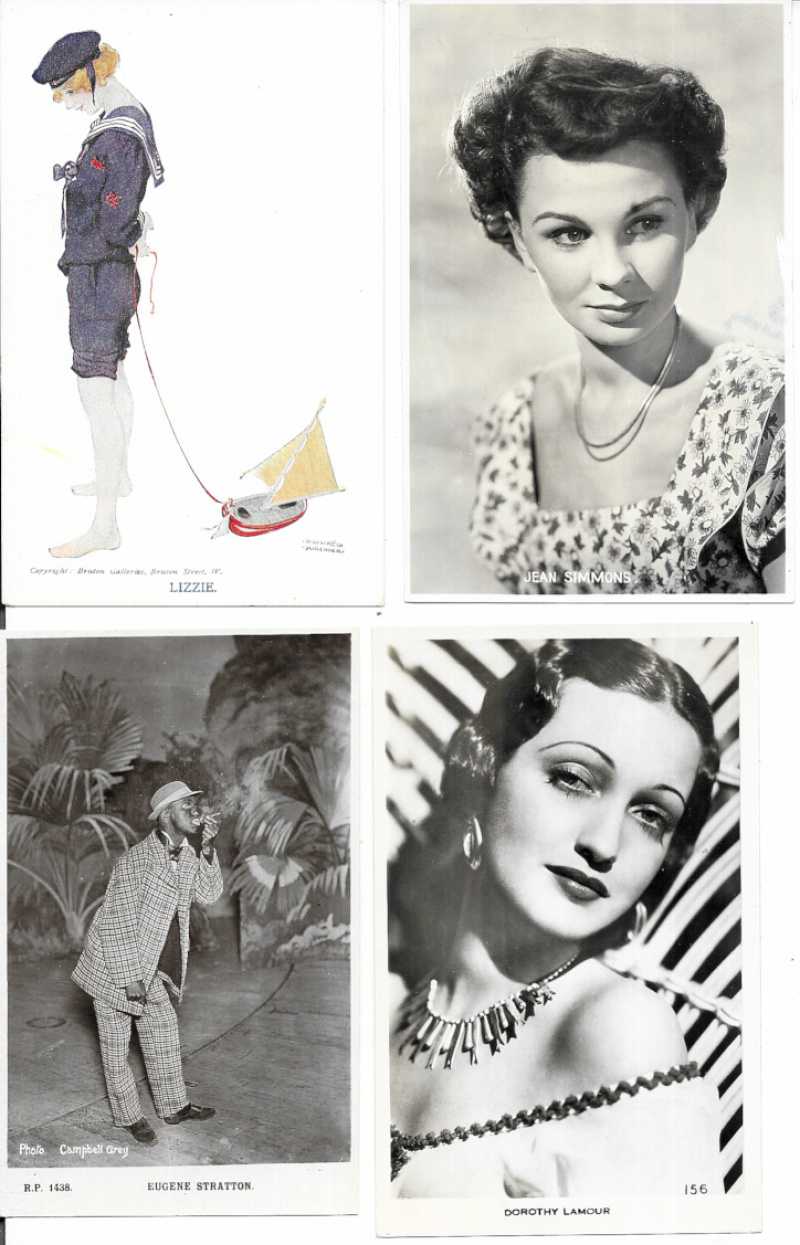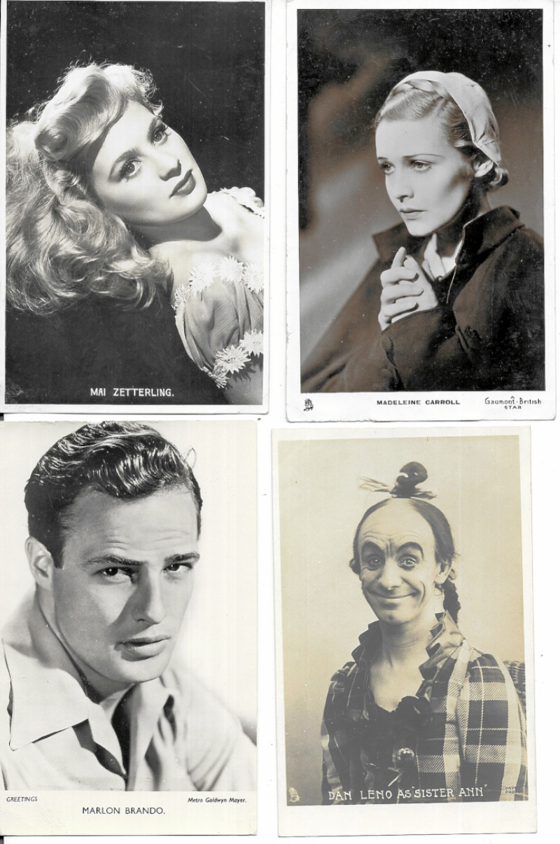 Entertainers 1900s to 1990s including Fred Astaire, Dan Leno, Clark Gable, Marlon Brando, Madeleine Carroll, Mai Zetterling, Dorothy Lamour, Eugene Stratton and others, plus fine Kirchner ‘Bruton Galleries' card. Includes some plain back photos including snapshots. (88)