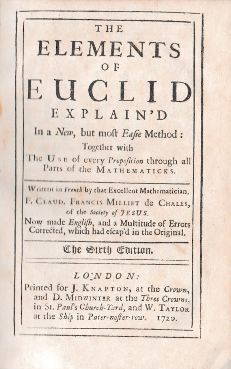 F. Claude Francis Milliet de Chales The Elements of Euclid Explain’d in a New but most Easie Method: Together with the Use of every Proposition through all Parts of the Mathematicks. J. Knapton & D. Midwinter, London, 1720, the 6th Edition; small octavo, full contemp. calf a little scuffed, lacking title labels; 18th Cent. ownership inscriptions to front pastedown; part of rear endpaper torn away; some light browning; [4], 380pp.