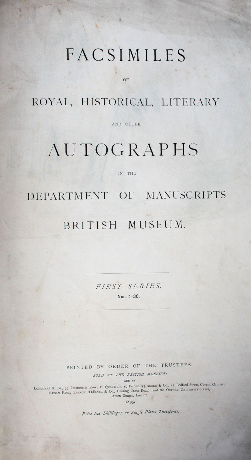 Facsimiles of Royal, Historical, Literary and other Autographs in the Department of Manuscripts, British Museum : First Series Nos. 1-30, London, 1895; folio, quarter-leather, gilt title, re-cased with new endpapers; title page dust-affected.