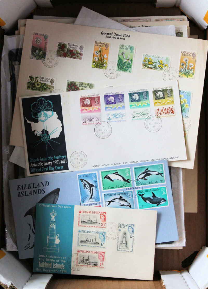 Falkland Islands and B.A.T. philatelic covers, mostly FDCs, with duplication, plus some UM Falklands stamps Cat abt £250. (106 covers, plus stamps)