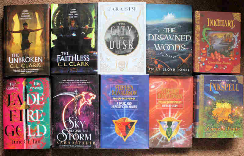 Fantasy Fiction signed first editions with works by C.L. Clark (2), June C.L. Tan, Stephen Donaldson (2), Cornelia Funke (2), Tara Sim, Emily Lloyd-Jones and Sabaa Tahir, two with decorated fore-edge. All in complete d/jkts; the Donaldson titles signed on bookplates loosely inserted. VF. (10)