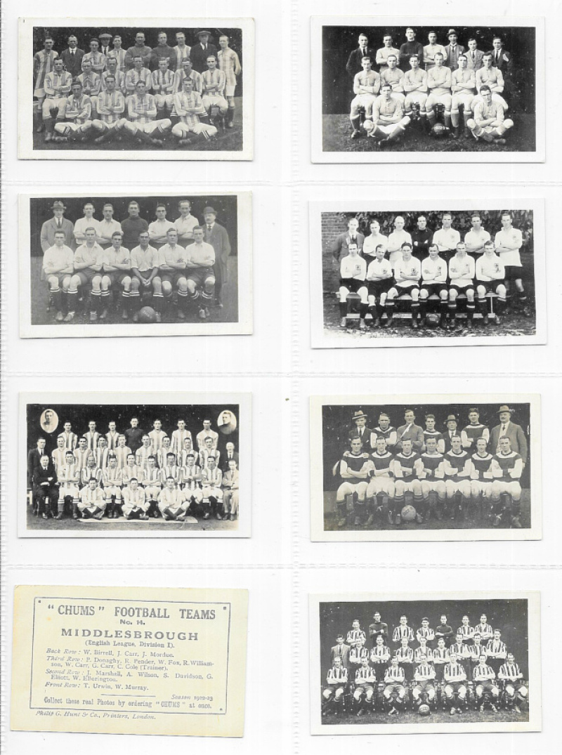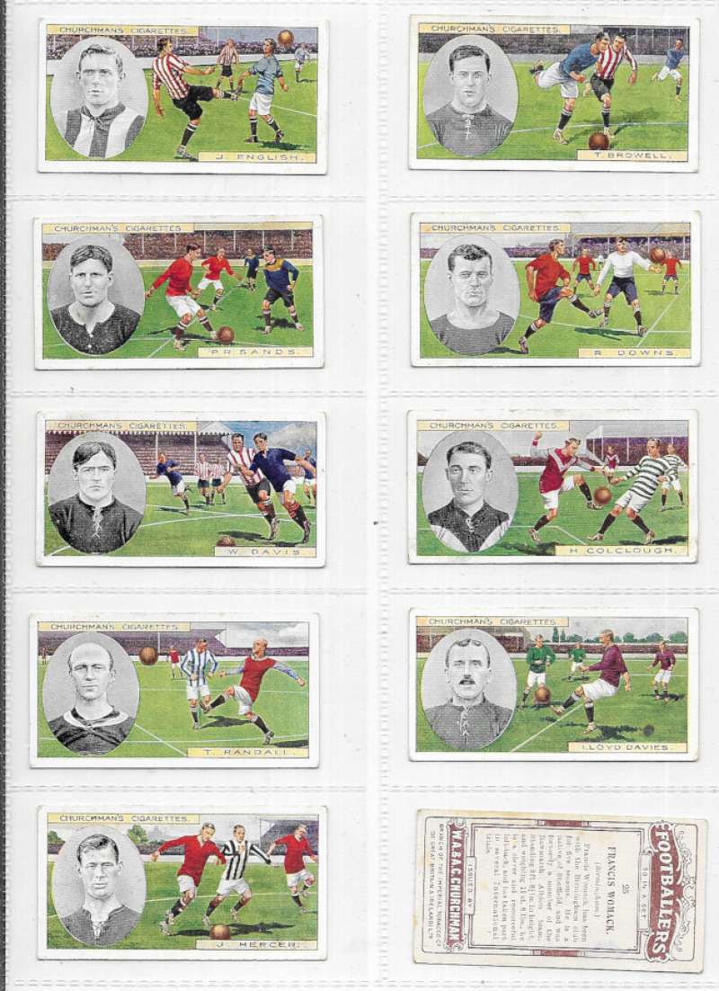 Football collection in two modern albums with many sets including Churchman Footballers (coloured, 1914, card #19 stained), R. & J. Hill Popular Footballers series B, Wills Association Footballers 1939, Chums Football Teams 1922, Player's Footballers Caricatures by ‘RIP', National Spastics Famous Footballers, Mitchell Scottish Football Snaps, Phillips Soccer Stars, Leaf Brands Footballers 1961, Kane Products International Football Stars, D.C. Thomson Famous Footballers 1955, and Golden Wonder World Cup Soccer All Stars. Largely good to VF, many excellent. Cat (Murray) £2160. Also some modern trade cards & oddments.