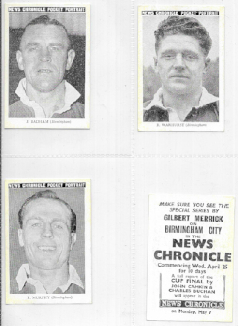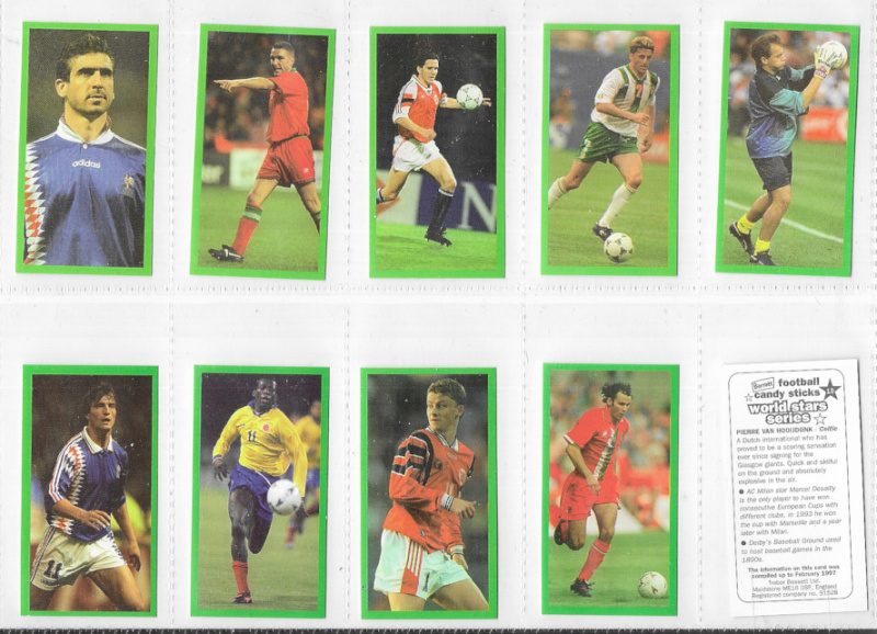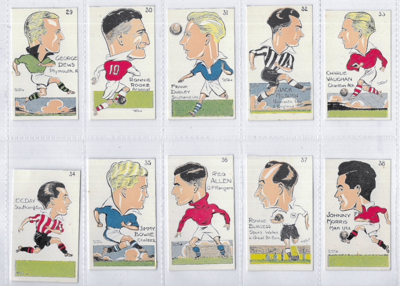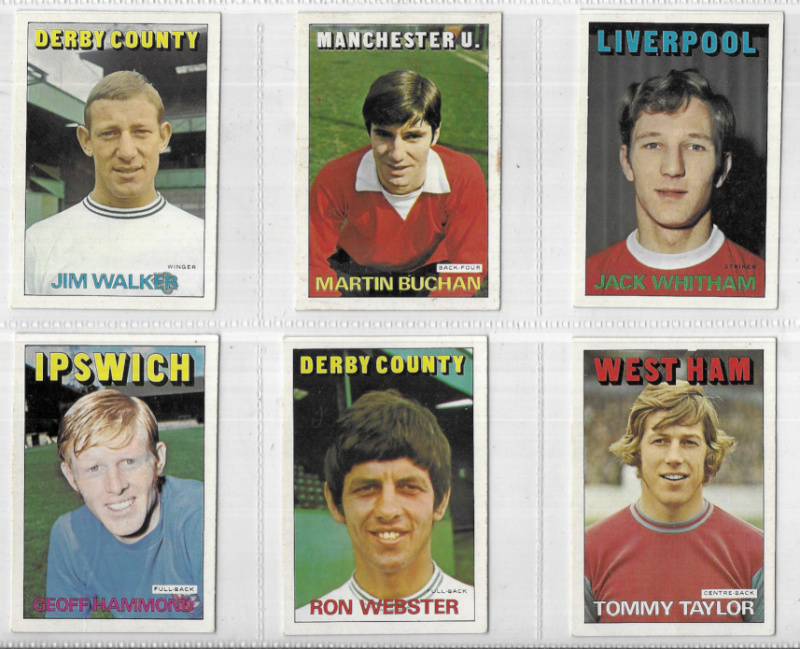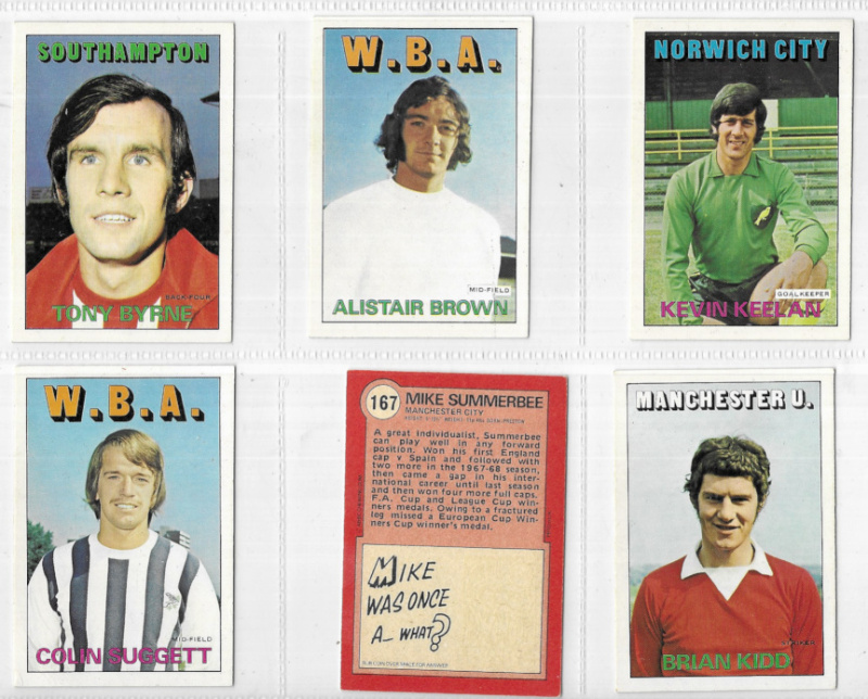 Football interest, five sets in album comprising A.& B.C. Gum Footballers 1972 (orange & red backs, #110-219); Bassett World Stars 1997 and World Heroes 1997; Sunday Empire News Famous Footballers of To-Day 1953 (trimmed along top edge), and News Chronicle Birmingham City (set of 13). A.& B.C. Gum set mainly fine but #110 (Emlyn Hughes) damaged, the checklist marked, and 10 others with a horizontal crease. Cat (Murray) £852.