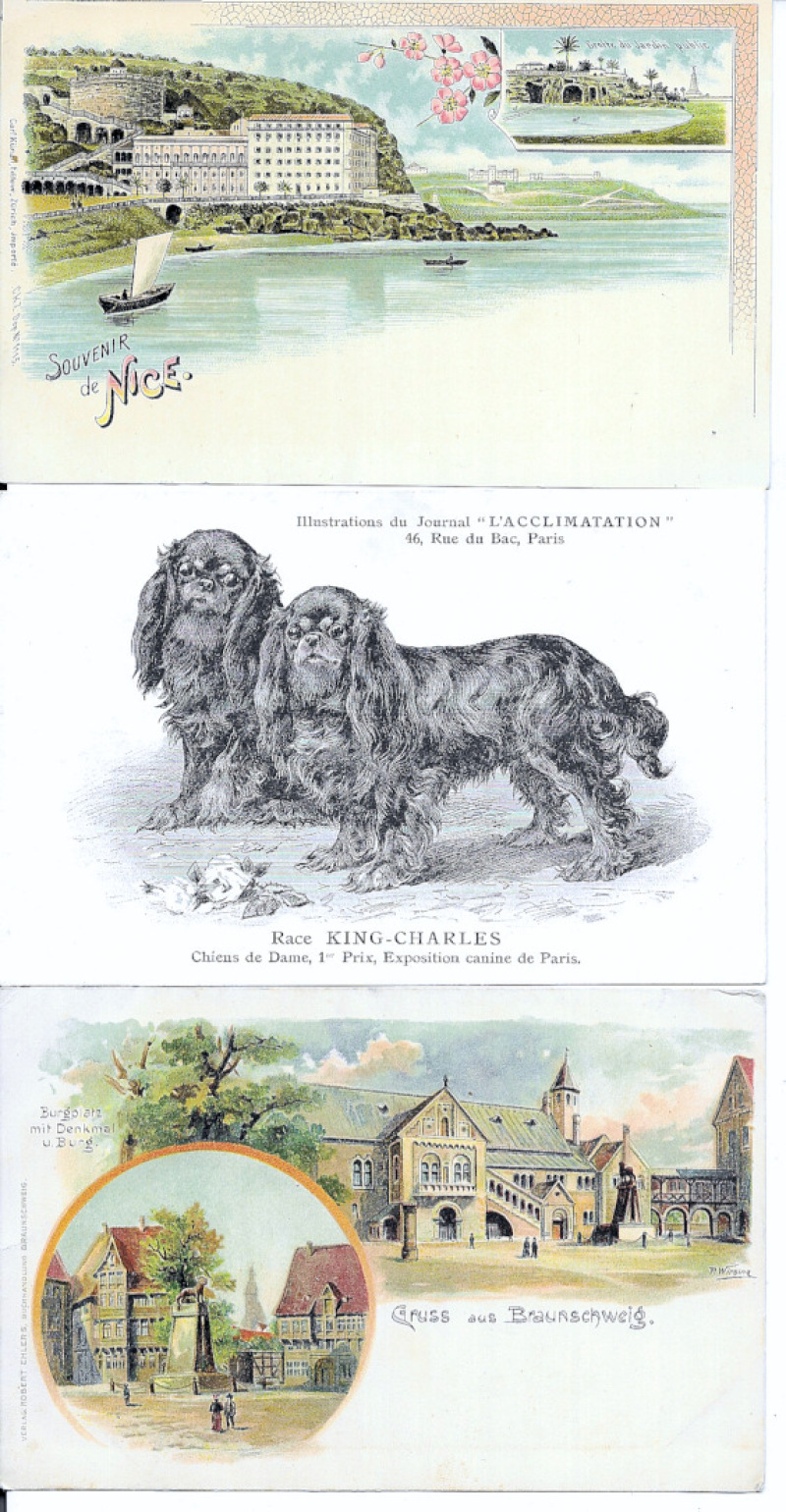 Foreign views and subjects, many pre-WWI, with early coloured chromos (35) including several ‘Gruss Aus' types; later views of St.Helena (3 RPs) and Sierra Leone (5); few political cartoons; dog breeds (10, all UB); and wide range of others. Many PU. Varied condition. (227)