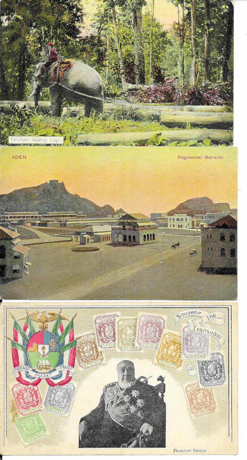 Foreign with main interest in Burma, Aden, Jamaica, & few Muscat, plus nice Transvaal embossed stamp card. Also set of 10 plain-back of China. Good to fine. (53)