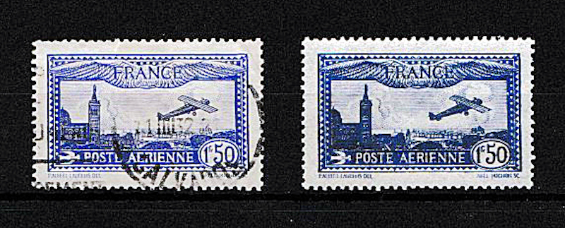 France 1930-32 1Fr Airmail, the rare Bright Ultramarine printing Fine Used, plus a mint example of the blue printing.