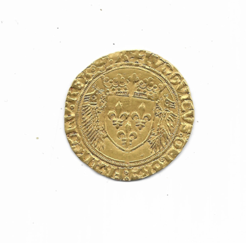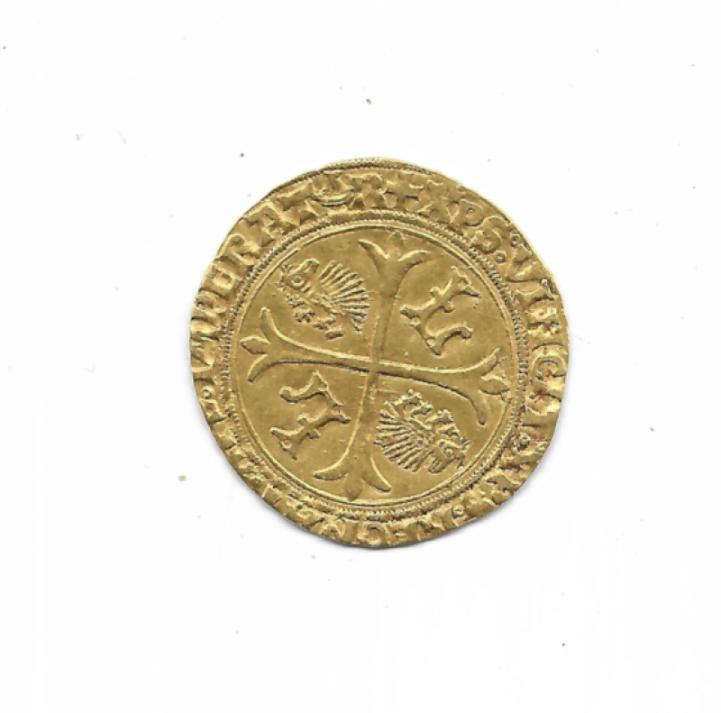 France. Louis XII (1462-1515), gold Écu d'or aux porcs-épics, c. 1498-1515, Lyon, crowned coat of arms with porcupines flanking. Reverse: Cross achée; porcupine and L in opposite quarters. Coin weight 3.3grms. VF/EF