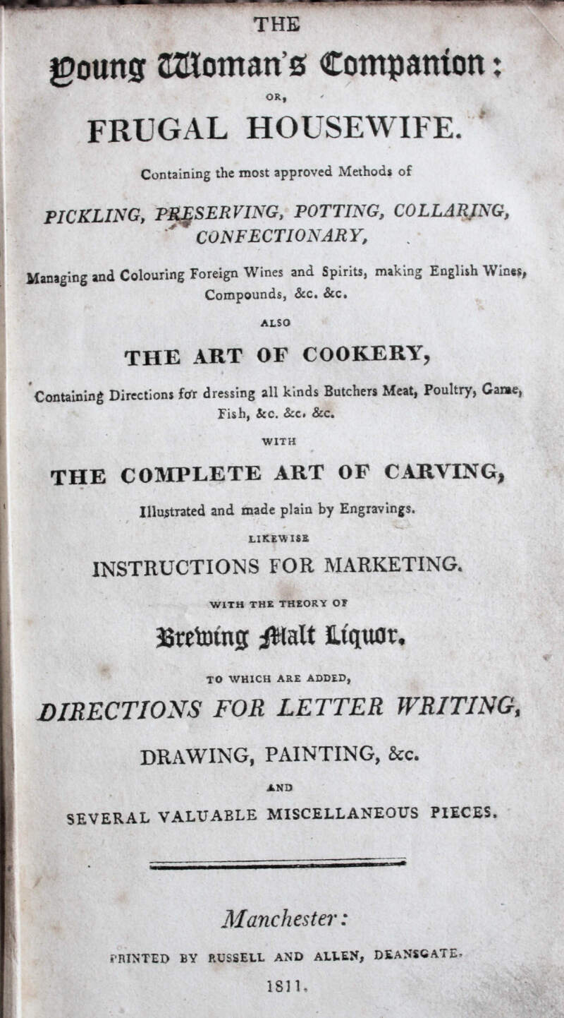 Gastronomy selection including The Young Woman's Companion; or, Frugal Housewife, Russell & Allen, Manchester, 1811, contemporary sheep, gilt leather title faded, inner hinges strengthened, o/w VG, manuscript recipe for “Chacknells” on rear endpaper; three different Mrs Beeton titles including fine 1968 facsimile edition of the first edition in full leather, issued by Times Newspapers; and four others. Good to fine. (8)